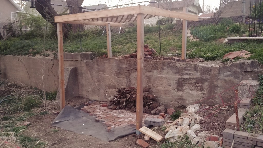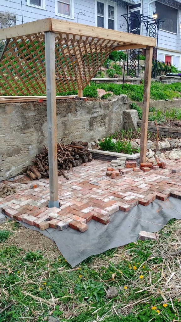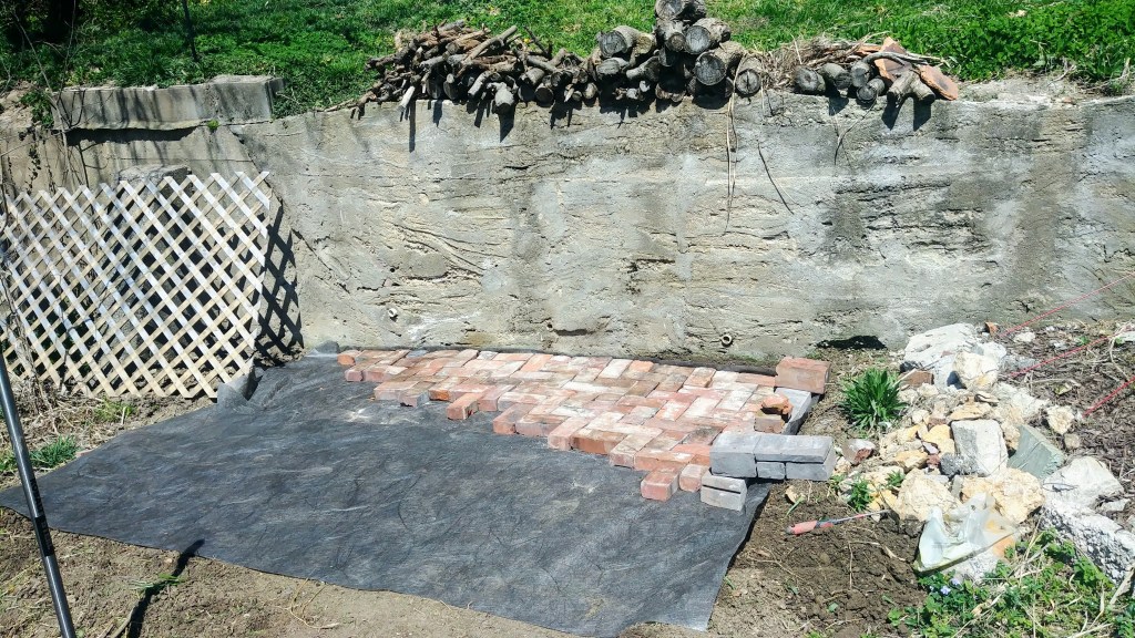 Day 1: tilling the ground; raking/levelling/stomping the loosened dirt; applying barrier cloth; starting herringbone brick pattern; framing structure