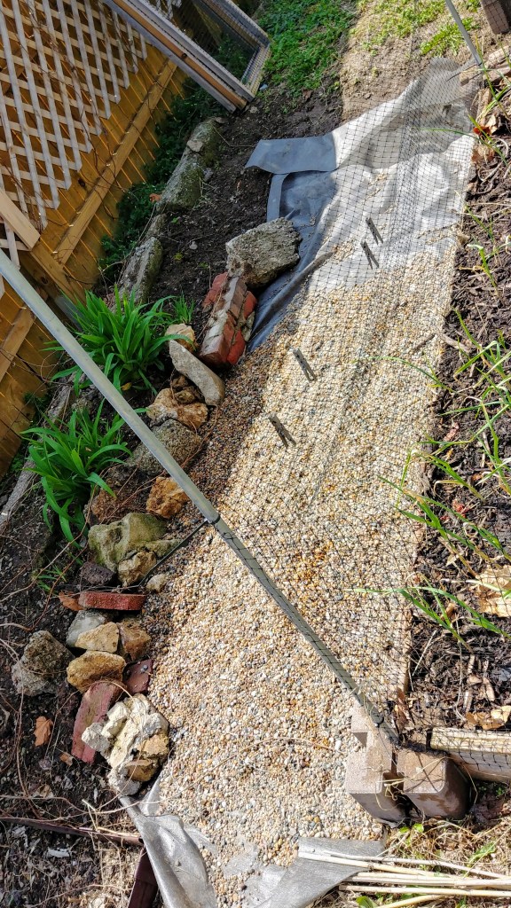I started with the pathway, letting it mostly follow the topography it already had; shaving out the low spot, laying down barrier cloth, placing border rocks/debris. For the pathway itself, I’ve decided on alternating between pea gravel and patches of brick, giving myself a use for the pile of broken bricks left over from the squash/melon arbor.
