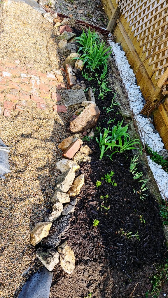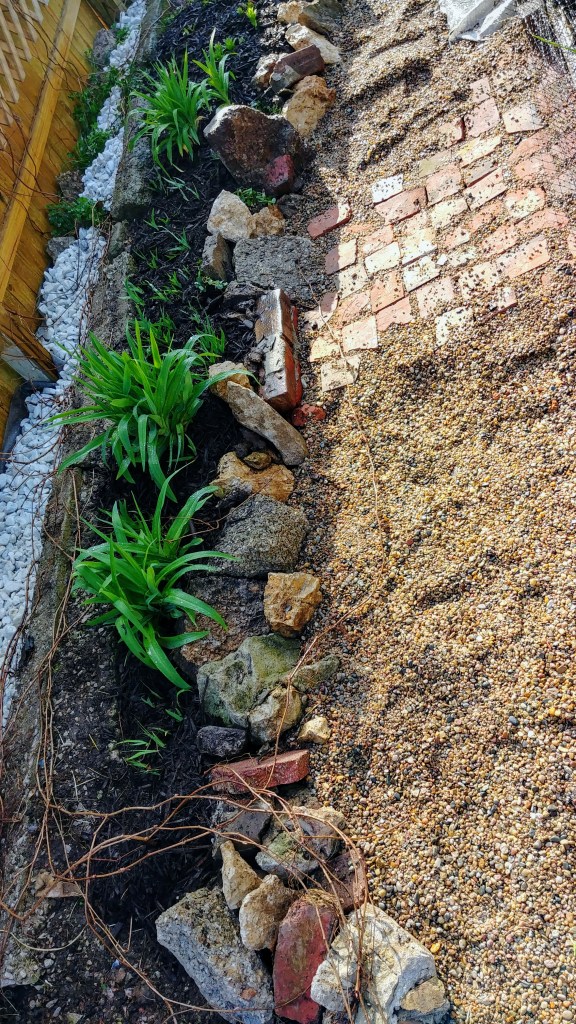 the fence-line fills in with a mix of tubers and bulbs: daylilies, blackberry lilies, and asiatic lilies. the pathway takes shapethe hodge-podge border is comprised mostly of limestone (I think) -reclaimed from under our sidewalk when the gas company excavated for new lines – and busted up concrete uncovered in the side lot from its previous home’s demolition. filling in are bits of asphalt, brick, broken cinder block and pavers found as I continue to develop the garden…I’m happy with the resulting look from insetting broken bricks in the pea gravel. it’s a great textural contrast and will help to unify different bits of the garden as a greater whole