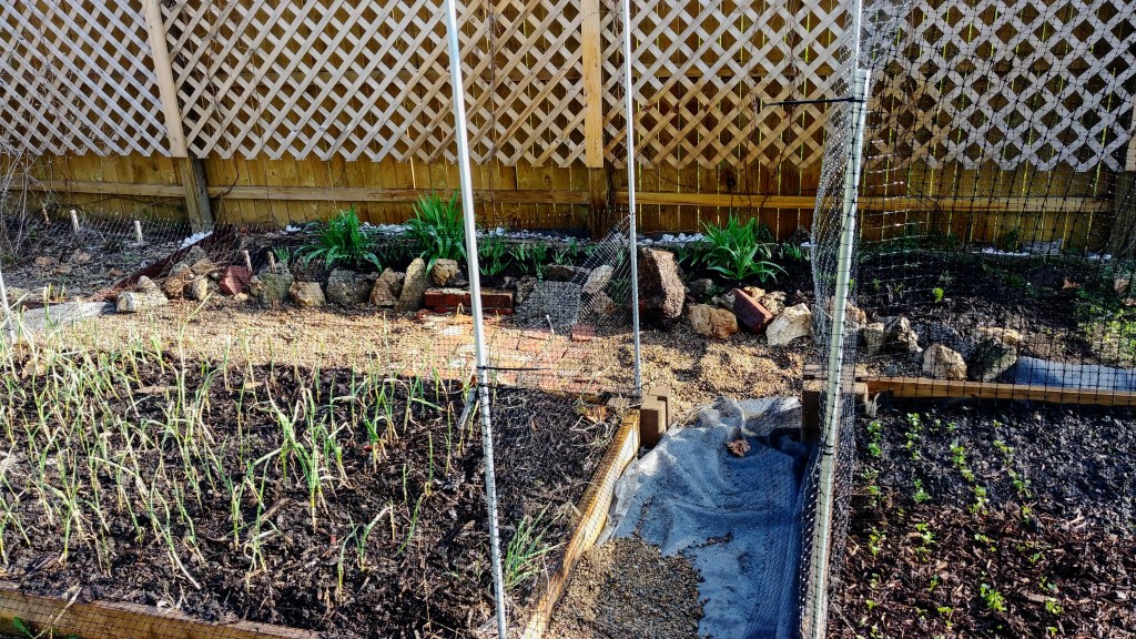 focusing on the pathway behind the back two 4×8 beds; the front currently packed with garlic, the back with a mix of radishes, beets, and carrotsstarted a couple weeks back, the southern fence-line bed is the perfect place for shade tolerant plants. by mid summer, these flowers will have all the sun they need as it moves overhead…
