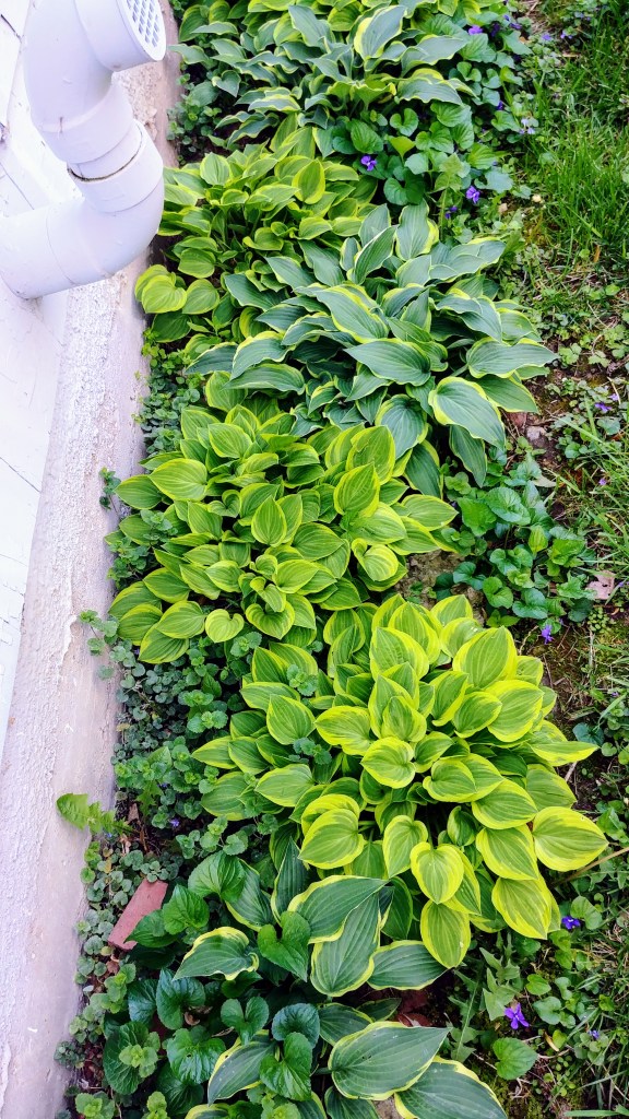 The hostas are digging the north side shade, having already forced the coral bells and most of the columbine out into other beds.