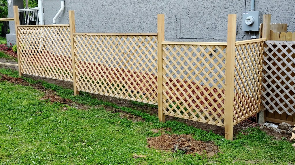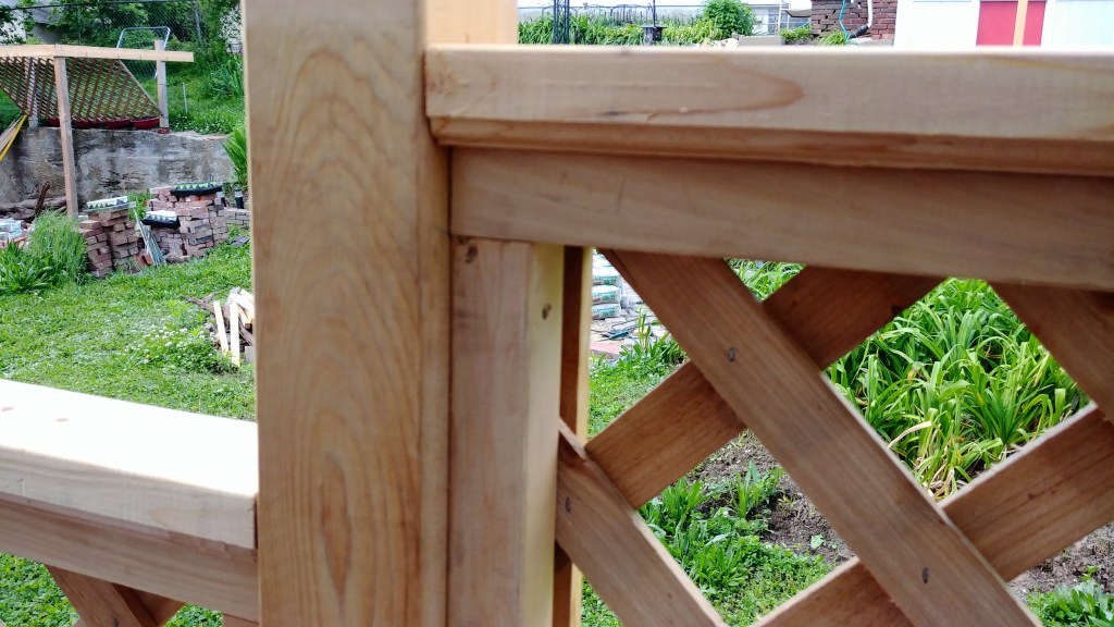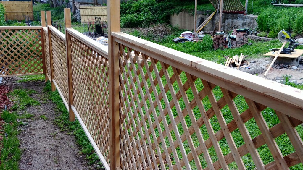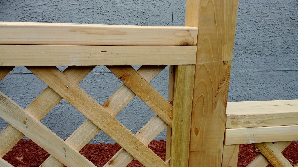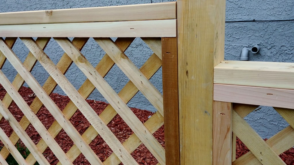 A productive weekend number two saw the last post go up, paneling go in on the side stretch, and the arbor finally connected into the railing. I also installed the second half of the far double gate.