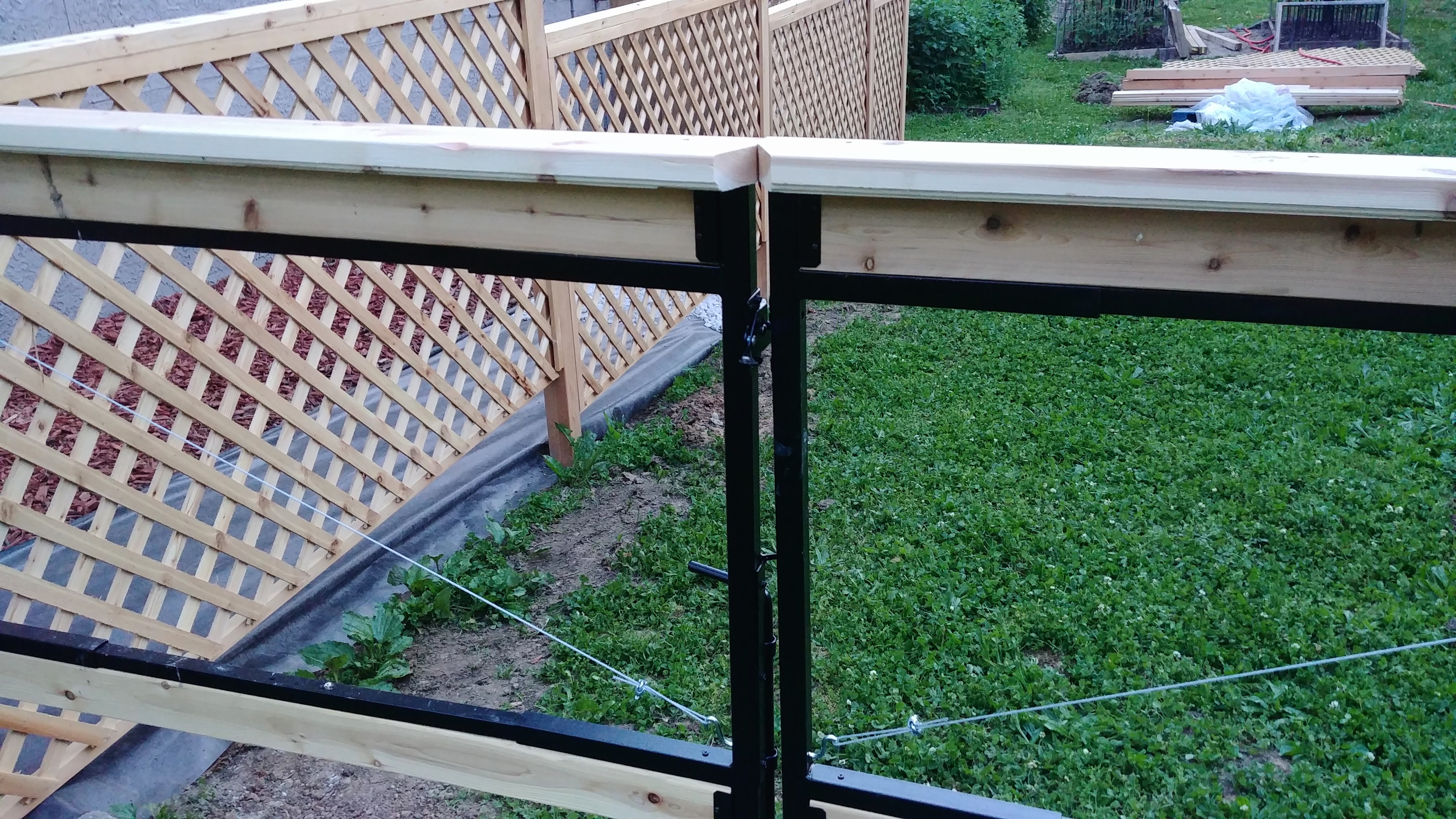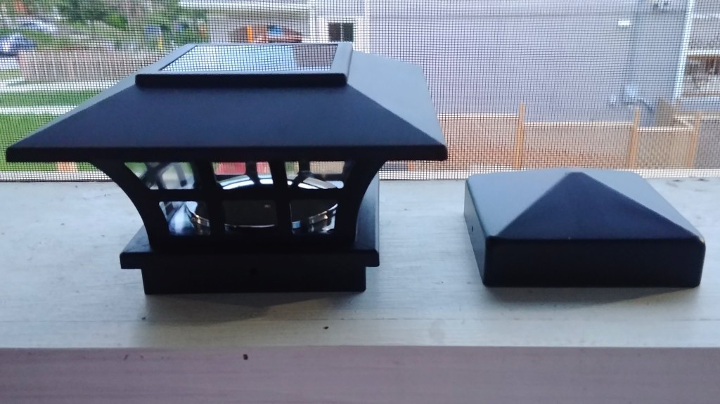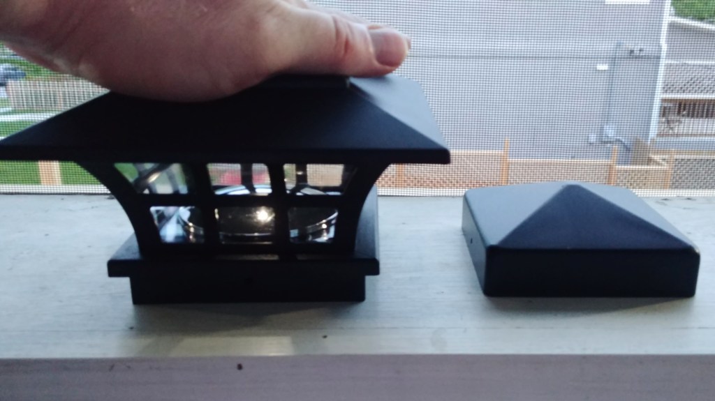 The lights will cap the gate and corner posts, and the metal pyramid will cap the rest.