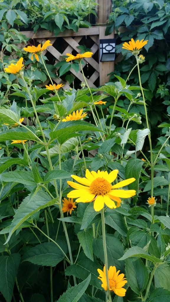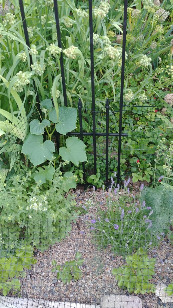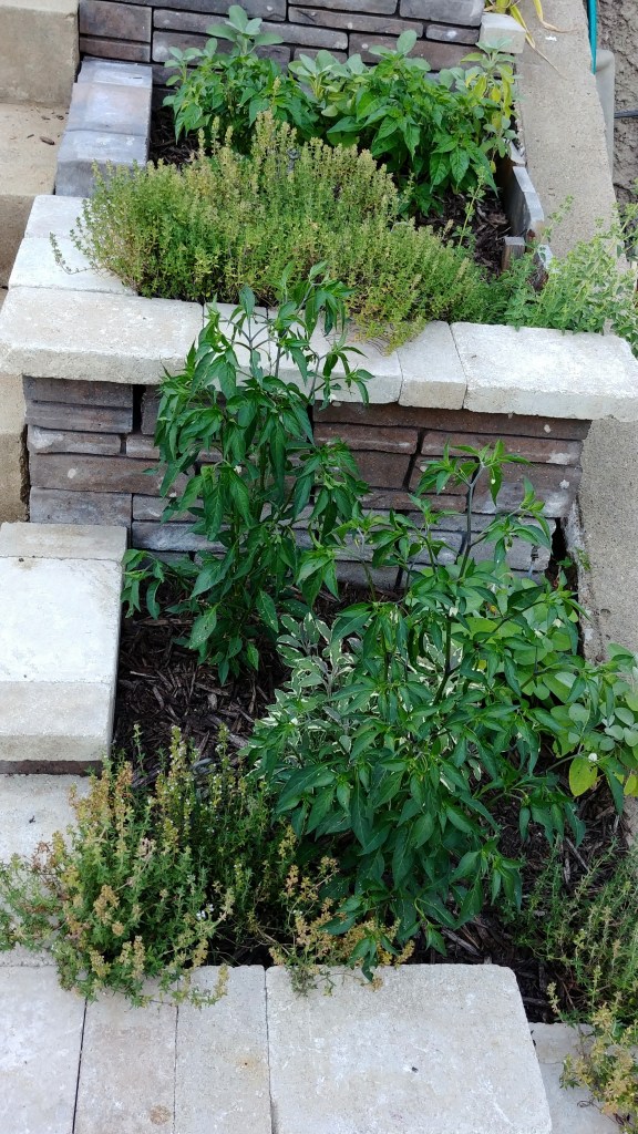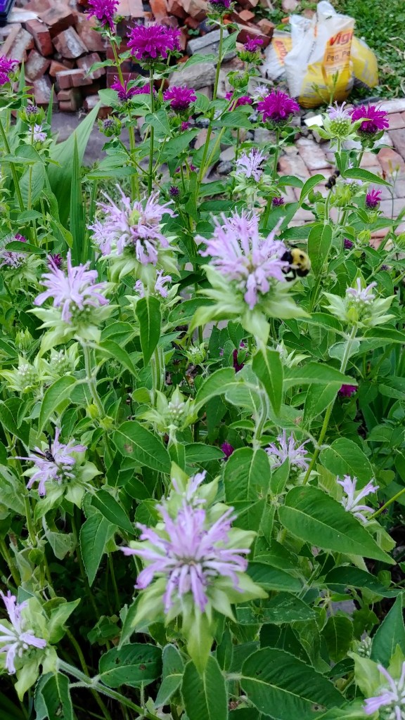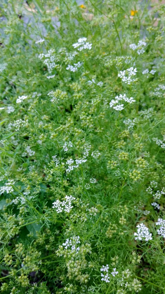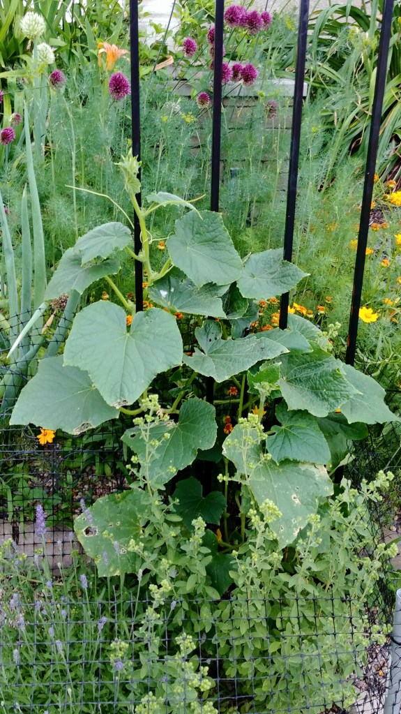 thyme, marjoram, sages, thai peppers, and habanerosromanesco zucchinilavender, oregano, lemon cukes, coreopsis, dill, drumstick aliumpink celery, oregano, lavender, lemon cuke, wild strawberry, spiderwortbee balm, nasturtium, dayliliesbee balm, and a bumblesan marzano tomatoesblack prince tomatoesnative cone flowermissouri wildflower, briefly thought to be cup flower, but the leaves don’t meet across the stem to form a cup…carrot topsbeni houshi mizuna, green wave mustardpurple lady bok choyoriole chardasiatic lilieslavendercilantro becoming coriander