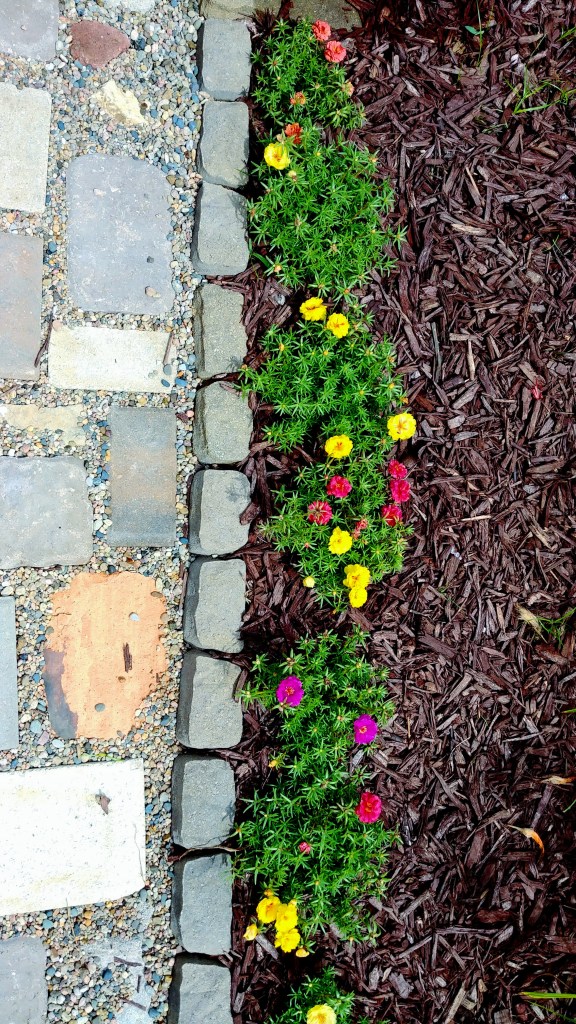 The portulaca along the arbor pathway are thriving from today’s big rain. The sun was out when I arrived home from work, and the colorful blooms were full and plentiful.