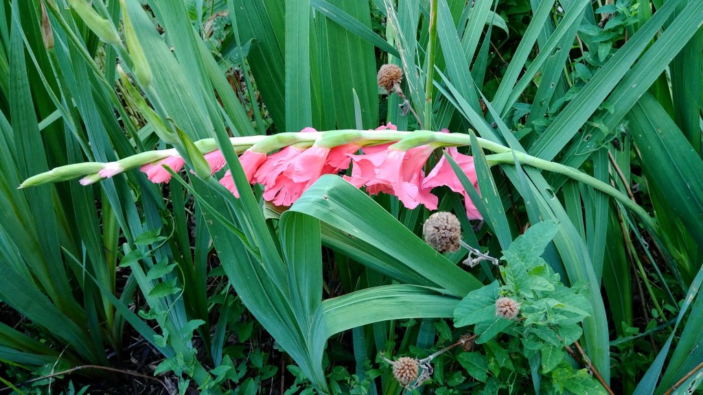 One last gladiolus draps across its bloomed out kin, surrounded by bee balm going to seed.