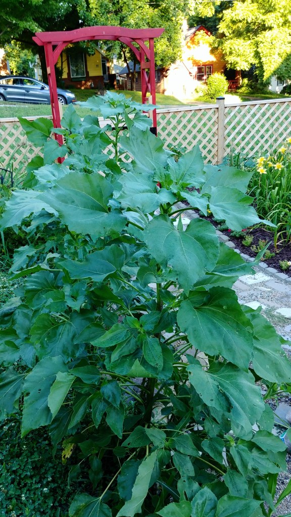 Lastly, we get volunteer sunflowers all about the garden. Curiously, those in full sun grow into massive tree-like monsters with adorable little sunflowers on each branch. In the shade, the same seeds produce smaller traditional single bloom sunflowers.