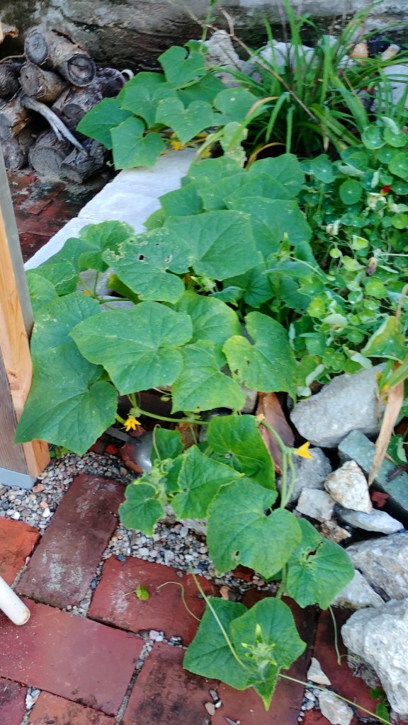 This year was our first attempt at cucumbers. We’ve lost a solid half of the plants. All of the lemon cukes are gone. But the plants below are quite happy.