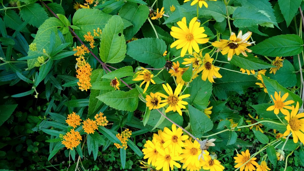 A few of our volunteer sunflowers have hit six foot in height.