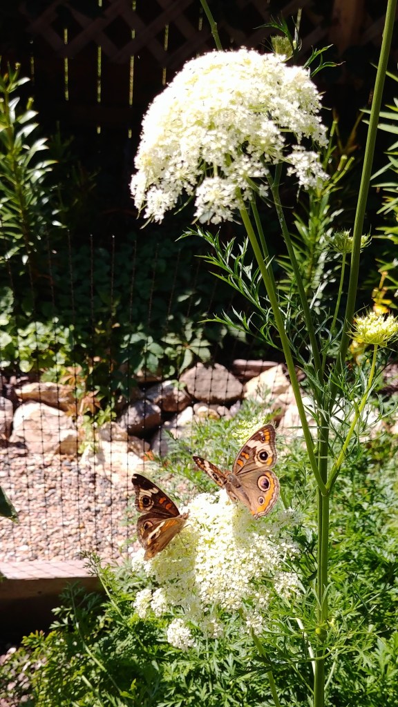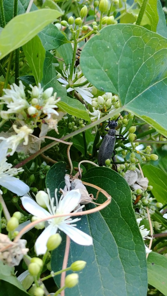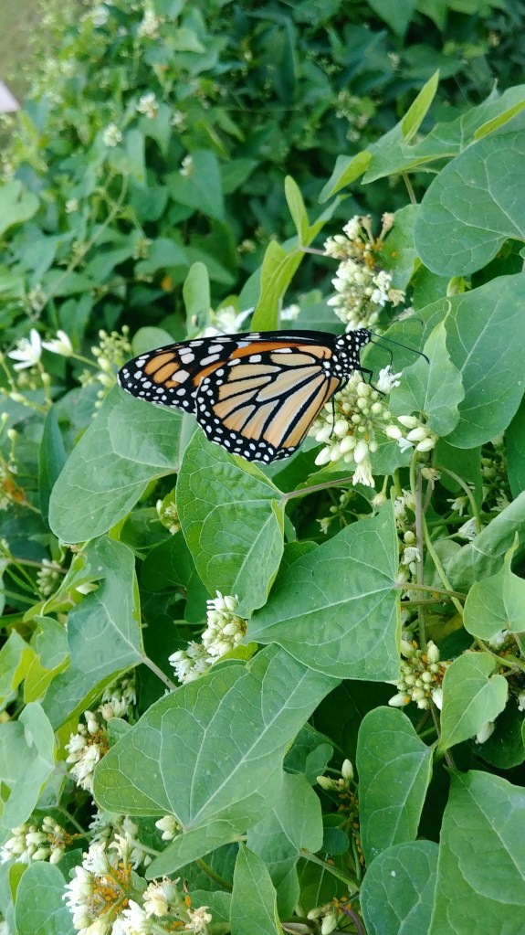 monarch in the fall clematis (there is milkweed vine woven in, which might help)