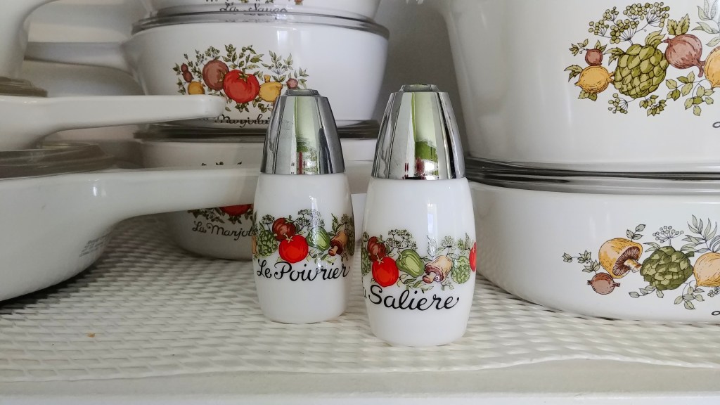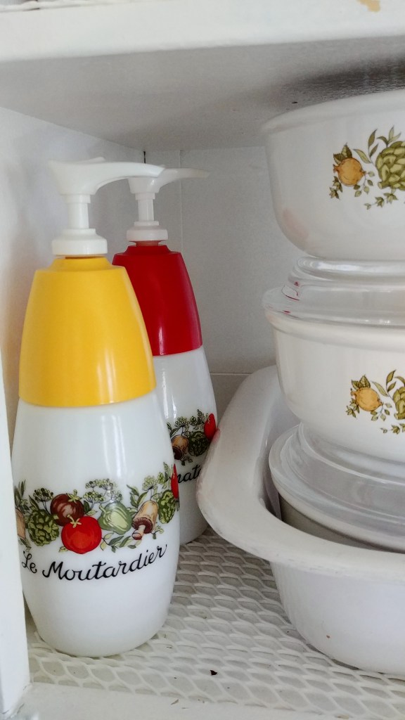 I thrifted the entire pile, mostly actually for cooking. I once found the milk glass vinegar and oil cruets, but left them on the shelf because “I only want the cookware.” Then I found and bought the milk glass shakers and condiment pumps…