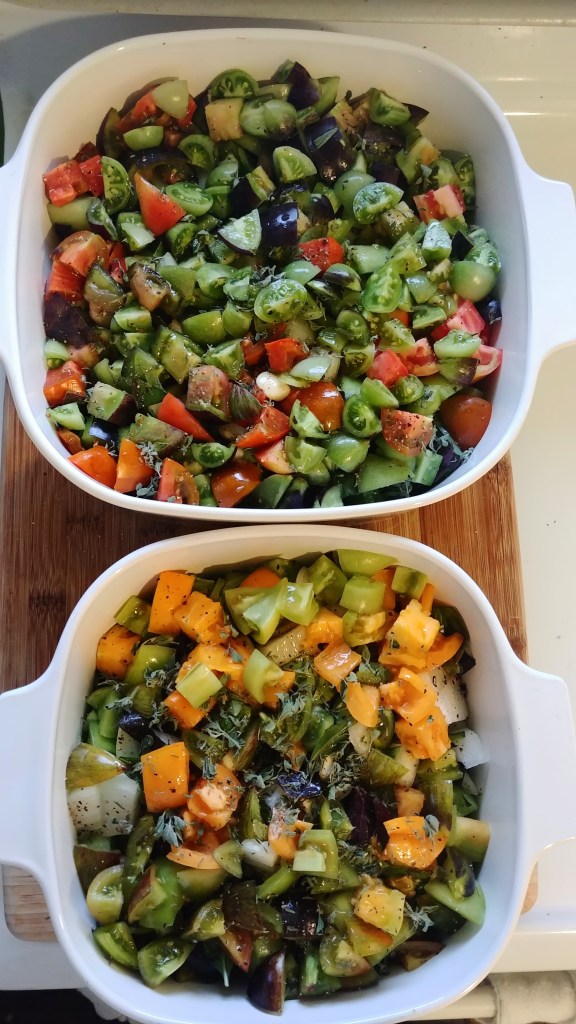 I harvested delicate things prior to the snow: tomatoes and herbs, planning for a batch of end of harvest soup.