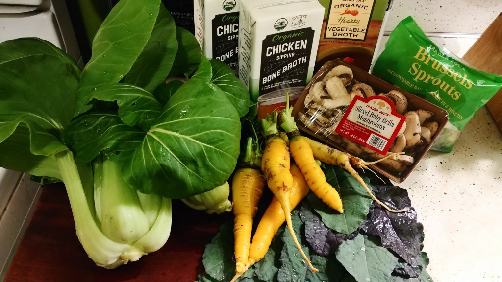 I sliced the carrots, Brussels sprouts, and bok choy stems, adding them to the broth base. I took an immersion blender to half of the roasted tomatoes, and added both pots to the soup.