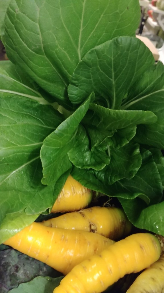 As the green tomato base roasted in the oven, I headed into the snow to harvest some hardier veggies: bok choy, carrots, and kale. (We opted to save the kale for something else.)