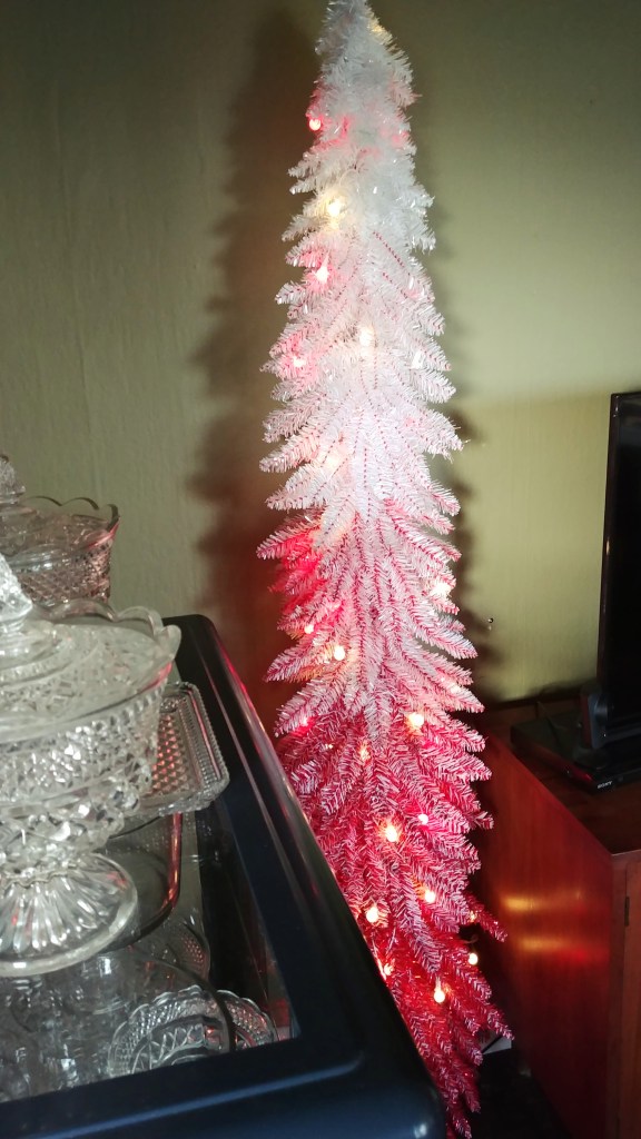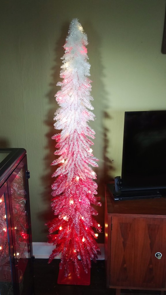 That is when I found the “6′ Pre-Lit Candy Cane Christmas Tree with 70 LED Lights”… The lights are a mix of white and red. The tree is super-slim, which helps in our crowded tv room.