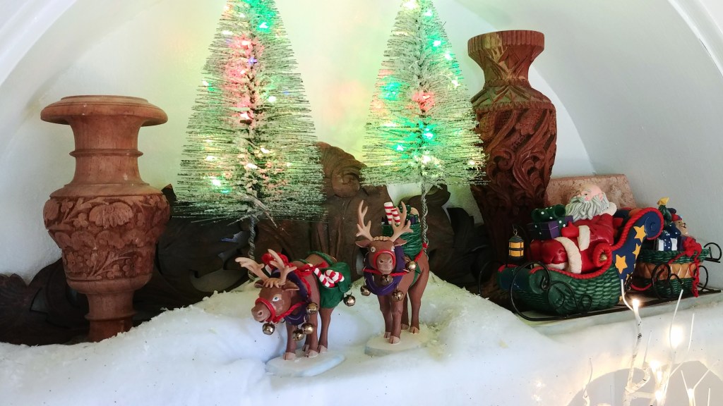 Great Uncle Pete tickles the keys on the upright in the conservatory, with children gaily singing out Here Comes Santa Claus.