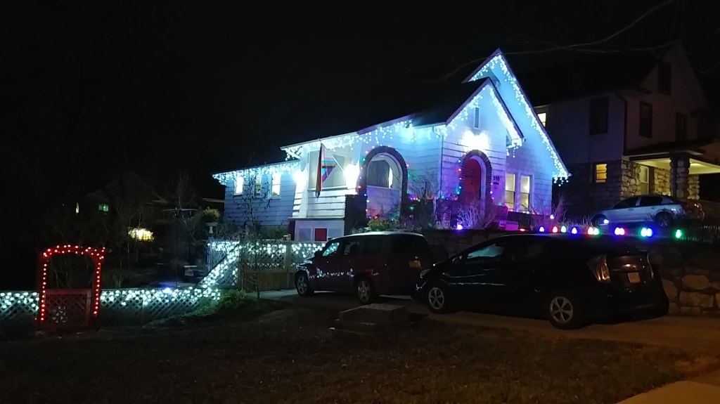 While I’ve had trees up inside for over a month, exterior decorations are different. Our family always lit the exterior of the house on Thanksgiving weekend, and I like keeping to that tradition. I admit I’ve never started on Thanksgiving Day. Until today.
