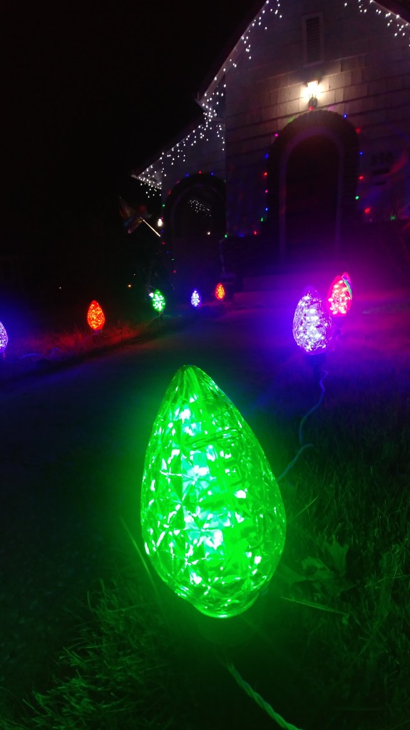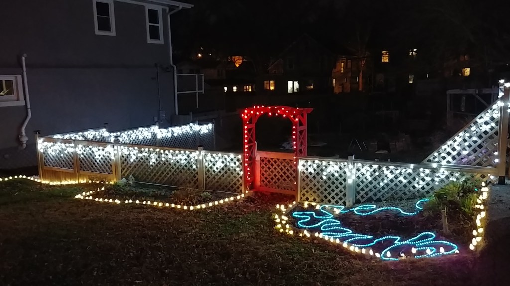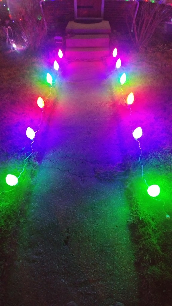 Today, while making room in the basement for garden furniture, I found the rest of my light stakes, so I tidied up the C-9 bulbs outlining the beds in front of the fence.