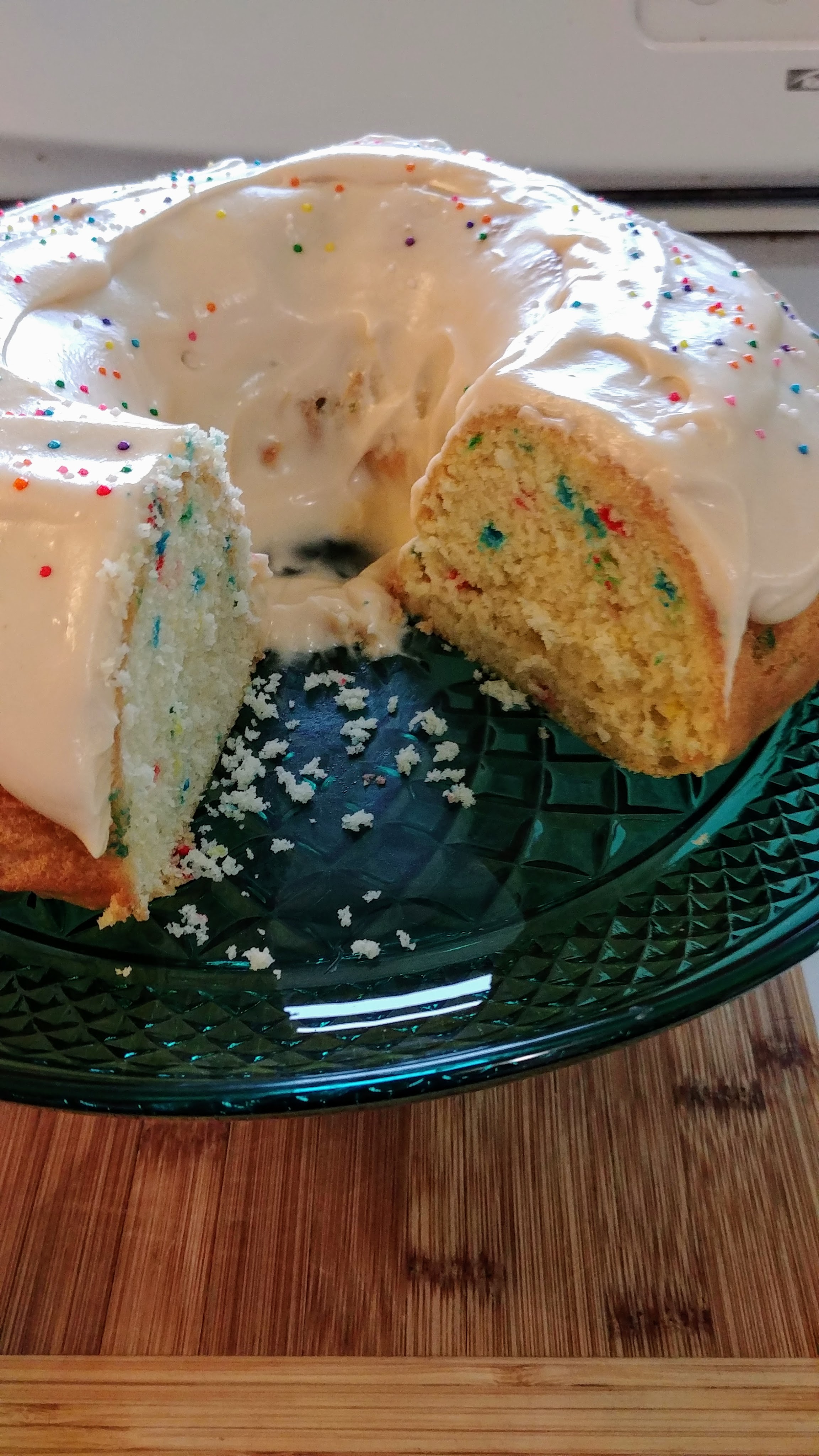 This one is Pillbury’s gluten free funfetti cake mix. A very similar cream cheese icing, but with some strawberry preserves and nonpareils because: fancy! This one is also moist and has a great crumb.