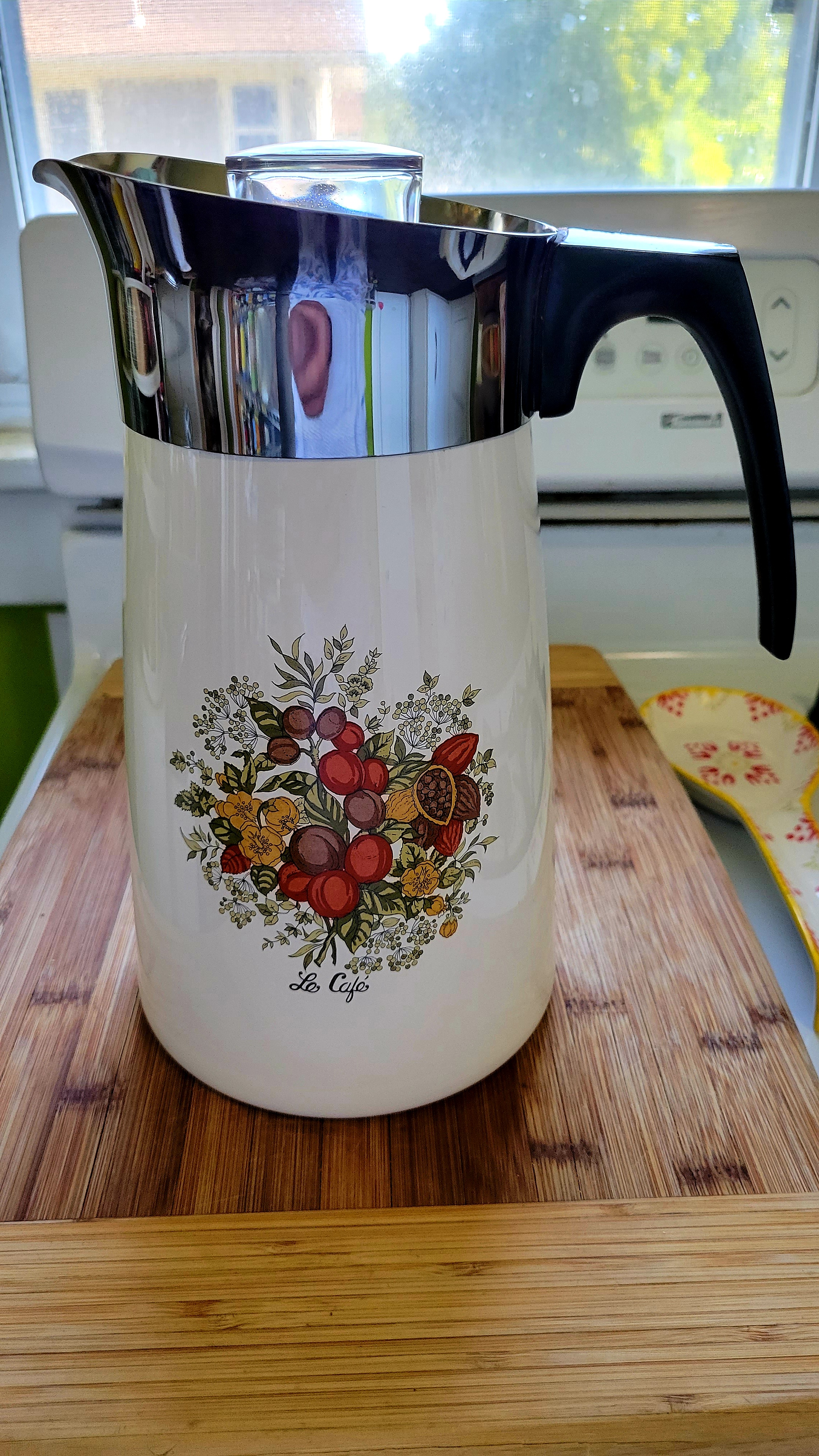 The coffee pot, oh, the coffee pot! Of course, it’s a percolator. Any future, post-pandemic, visiting coffee-drinkers, this is your fate. Celebrated or alarmed…