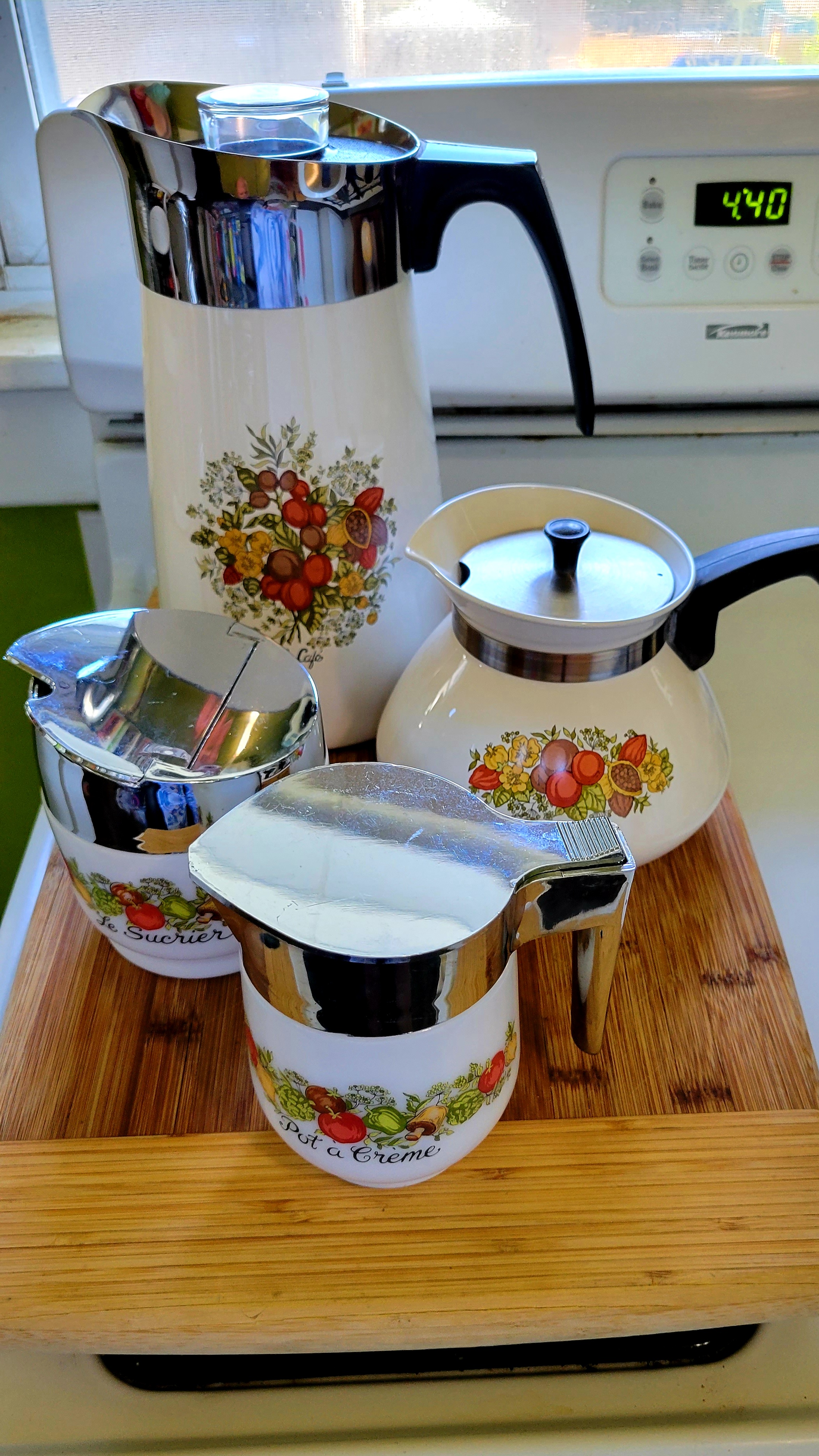 Moving on: I am not sure that the glass canisters are actually Spice of Life, as the stenciled artwork is different than that on the CorningWare, but it does match the Spice of Life glassware by Libby, so who can say. They are big and gorgeous and useful. This set came without original rubber seals, which should be expected, but standard sized silicone replacements are plentiful online.