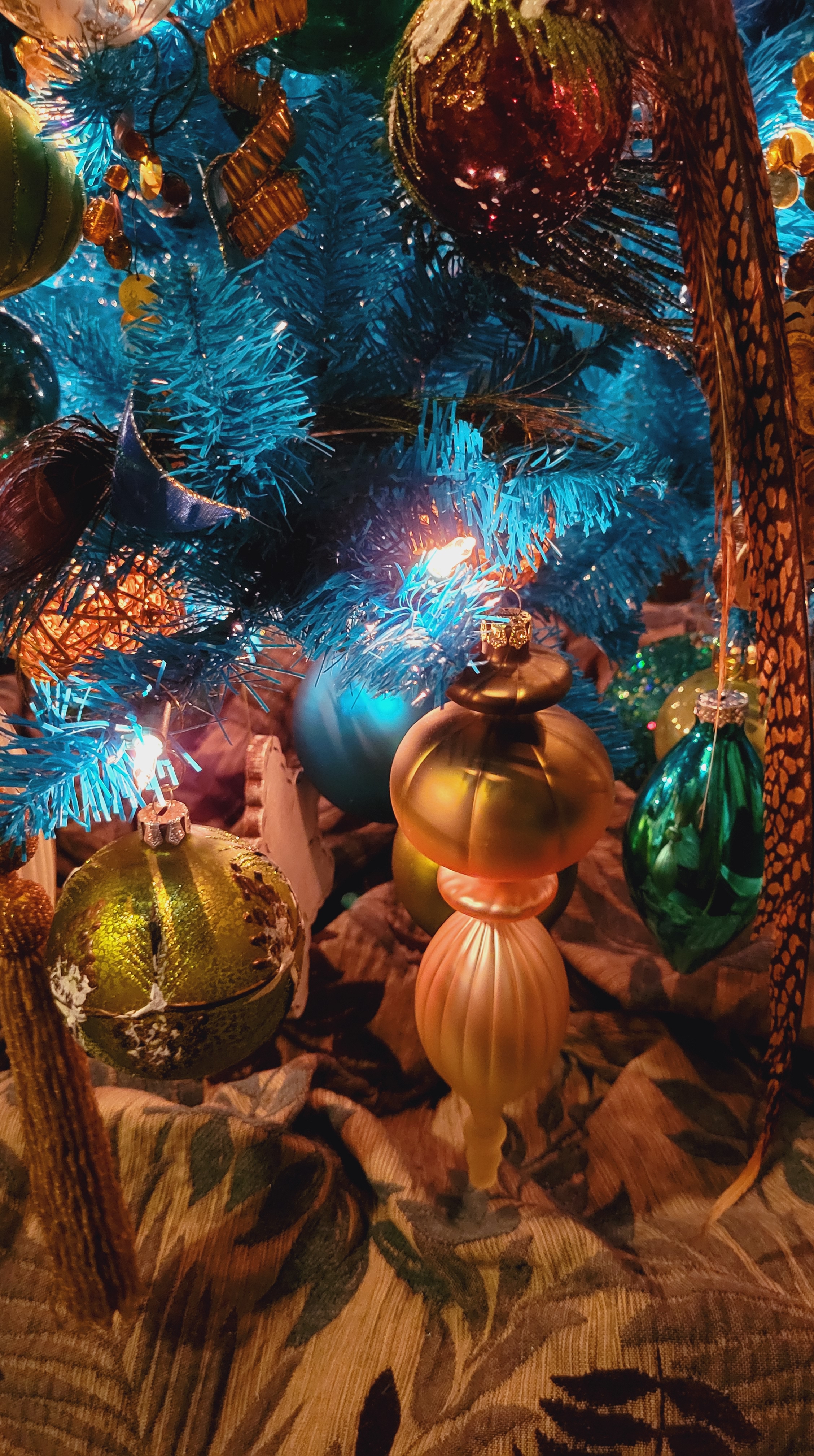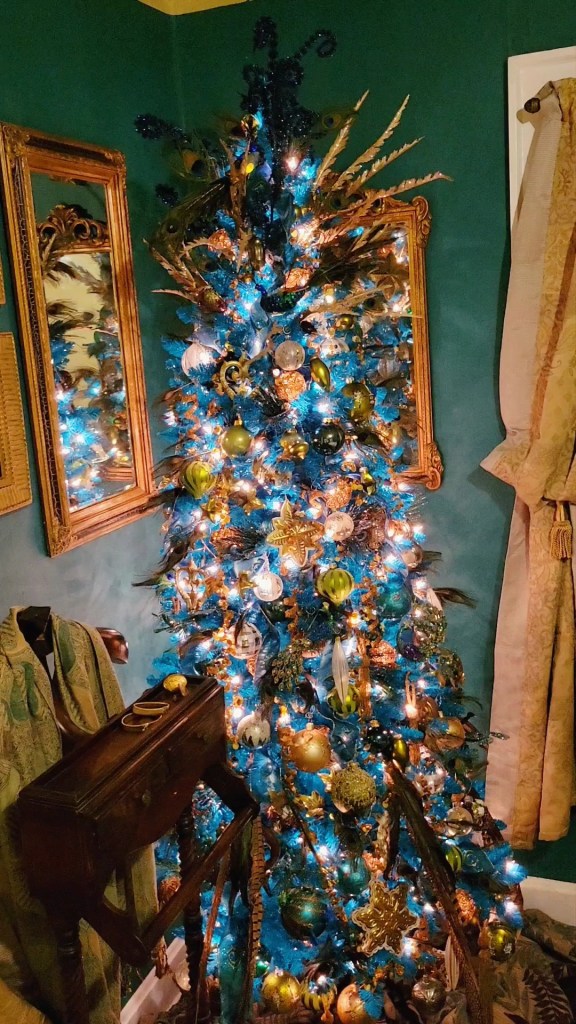 The teal tree started its life with us two years ago as the first incarnation of what has become the unicorn tree. It sat out last year, the pandemic preempting any plans for a holiday open house, but knowing it would replace the worn-out tree that held the peacock debut.