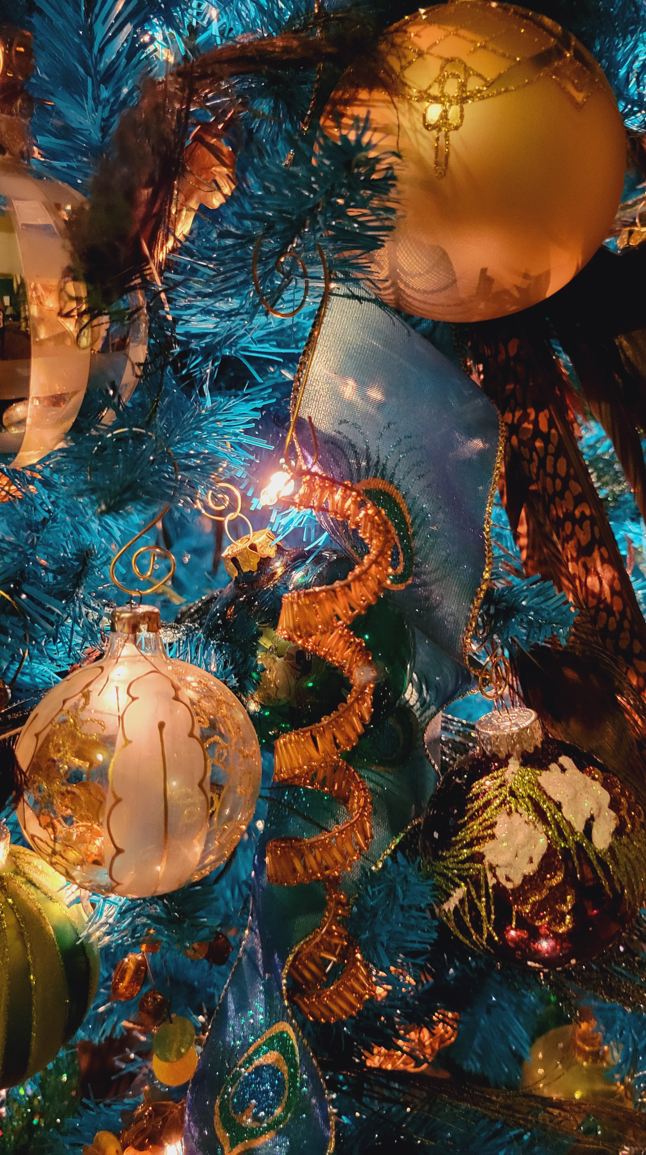 This tree has iridescent needles mixed in that provide a great spark from the lights. The teal color is amazing against the deep ocean green of our bedroom.