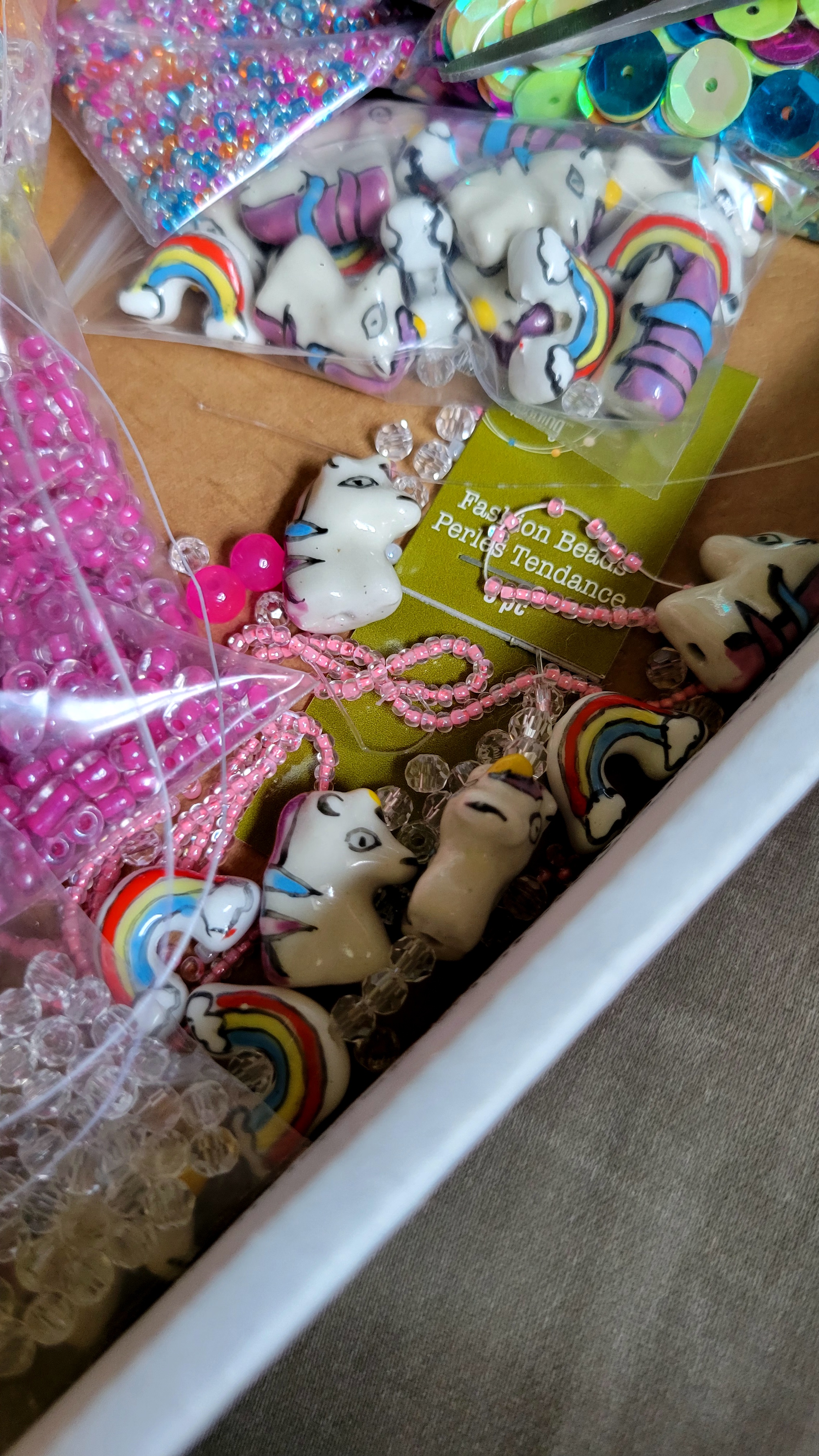 In the course of finding the hot pink spacer beads, I discover some ceramic unicorn and rainbow beads. I cannot pass such things up!