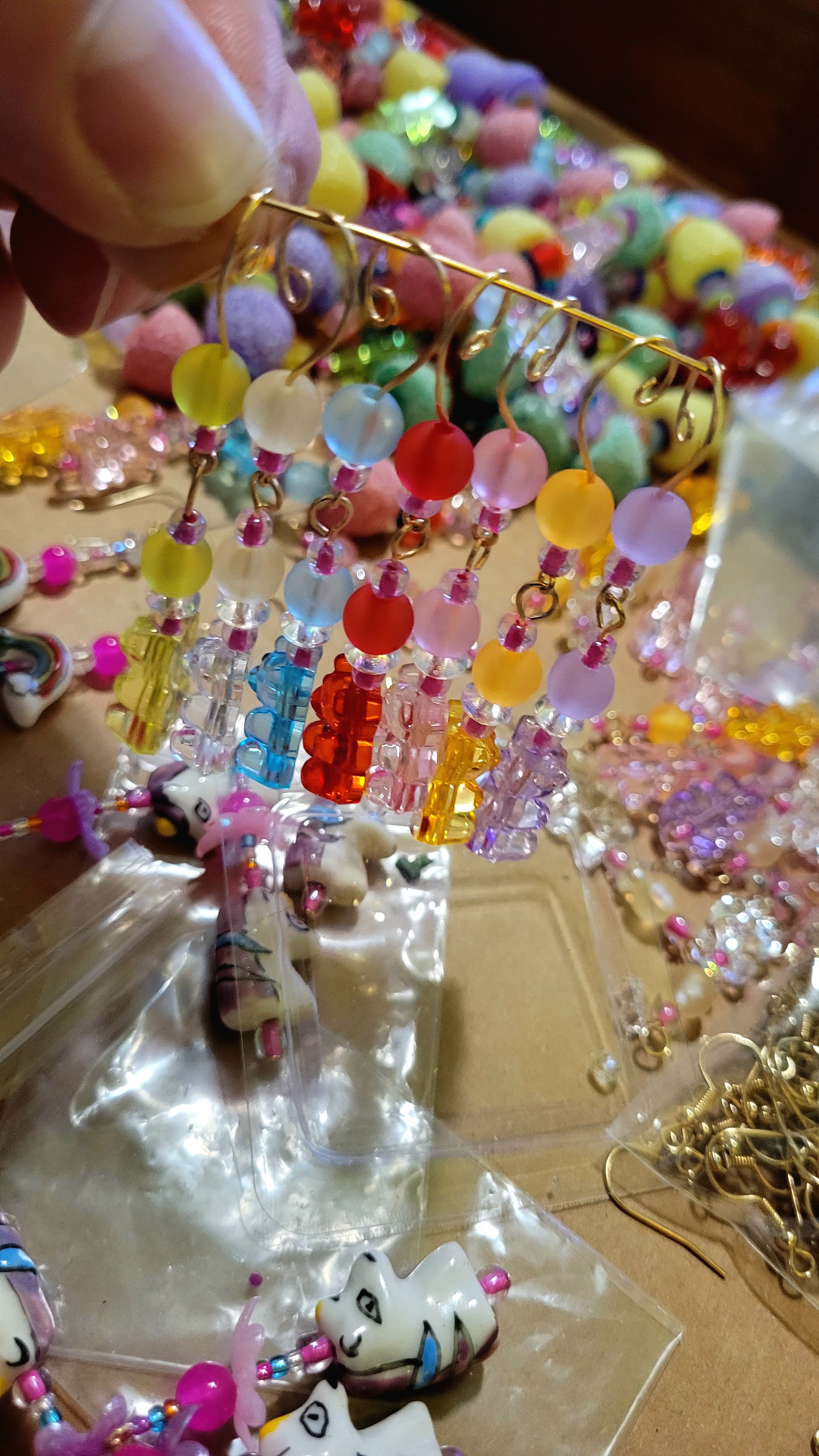 I found nearly full size acrylic gummi bear and full size gumdrop beads. Adding in some round frosted beads that evoke hard candies, hot pink spacer beads and multi-colored sequins I had everything needed for a bead garland befitting a sweets-ladened Unicorn Tree!