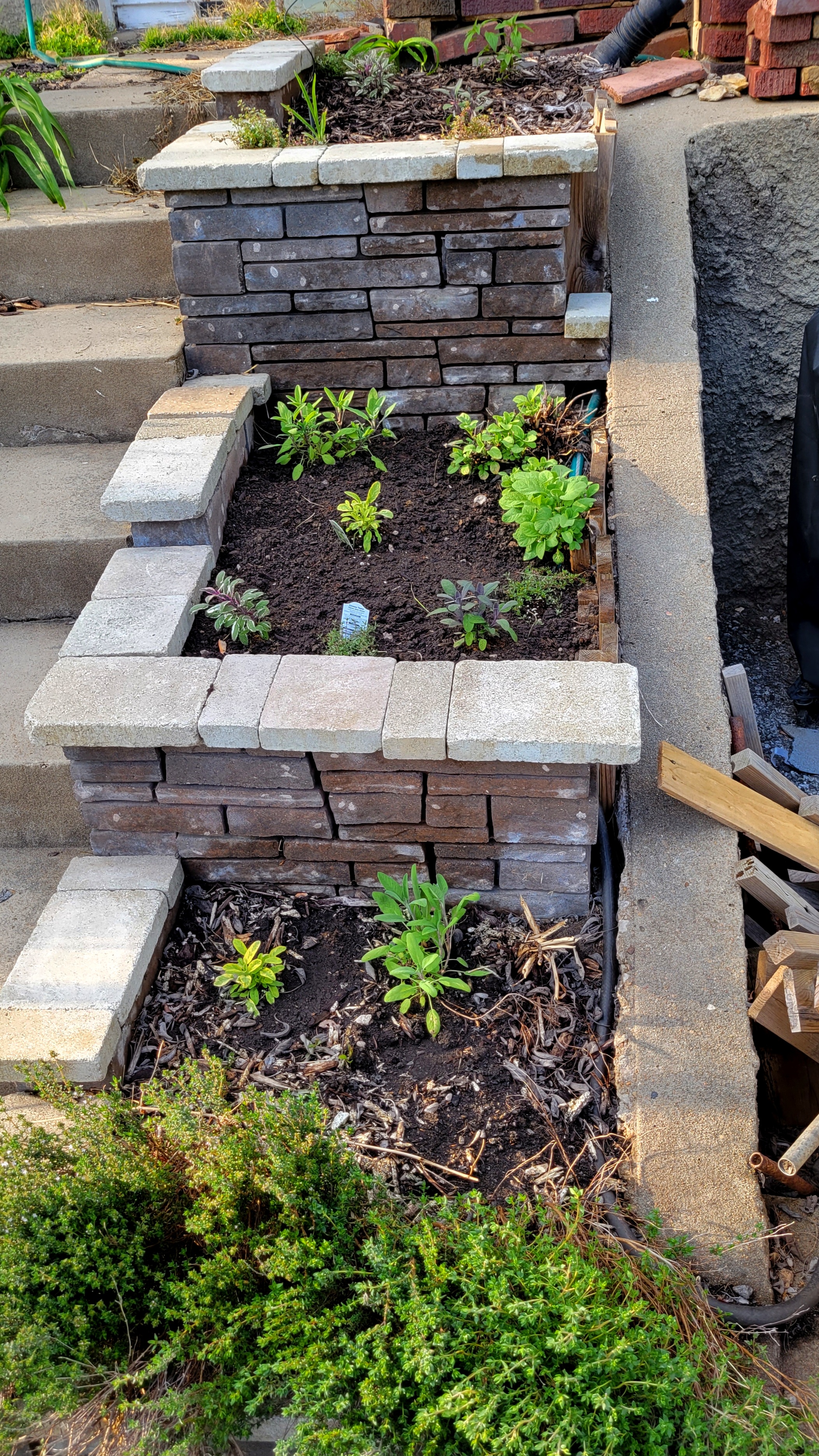 In the old lemon balm contaminated brassica bed, I sowed two packages of a dwarf stock color mix, a blue and a black-purple bachelor button, and some chamomile. I also transplanted some gifted bearded iris. Long-term plan is to encourage the self seeding flowers in the bed to break the boundaries of the bed and spread into the walkways, giving a planned overgrown/take-over feel to the flower side of the garden.