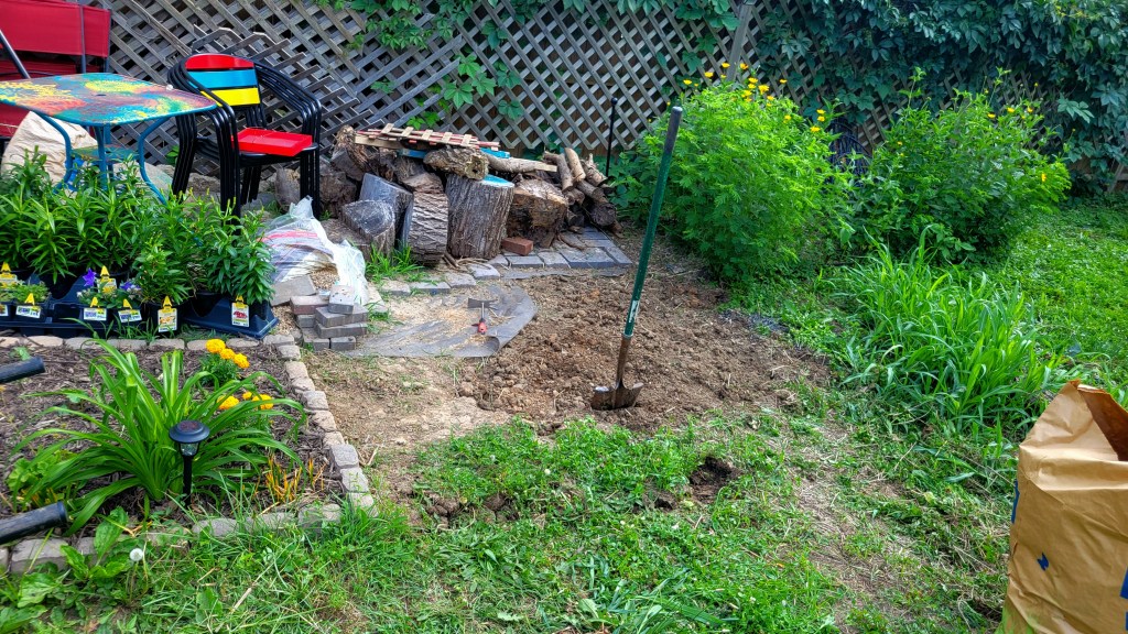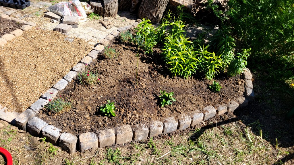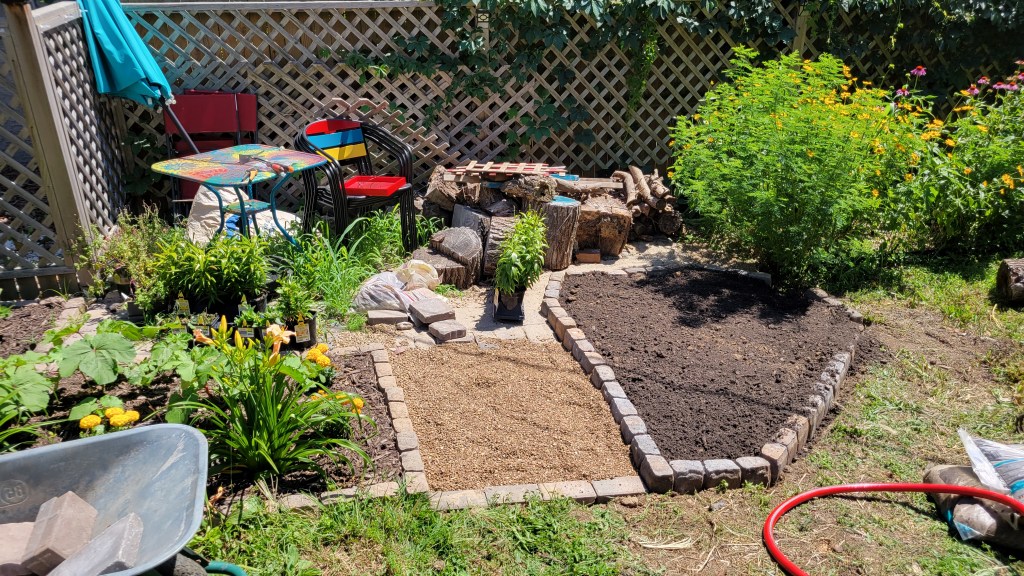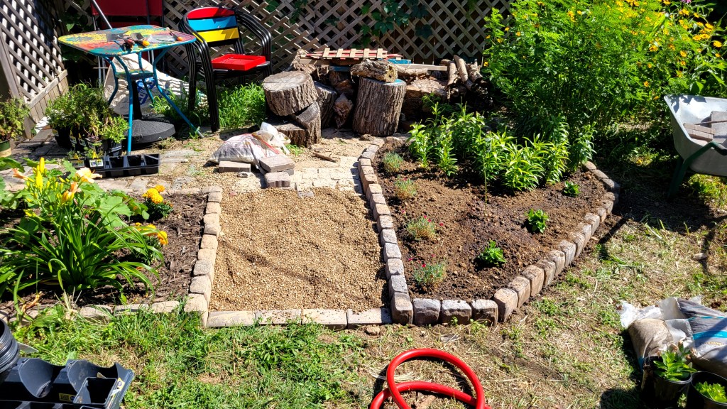 I began before the heat of the day, weeding, digging, adding topsoil, and setting border stones, gravel and pavers.