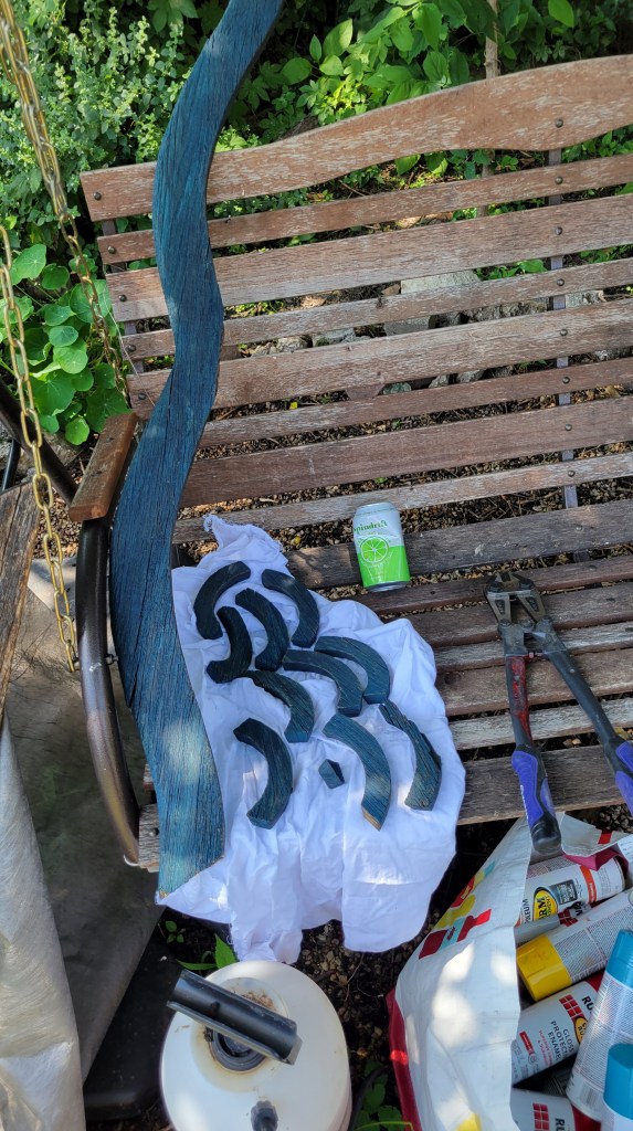 Wood slats will be stained and/or painted, the casted iron parts will get hand-painted shading, and everything will likely receive some dry-brushed details for depth and contrast, similar to the solar garden chandelier project.