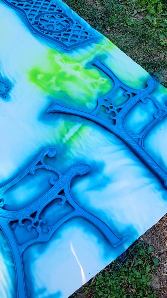 I cut “dropcloths” for spraying. This is for an experiment to make my own textile print for the pergola project. Next, I begin spraying the base coats.