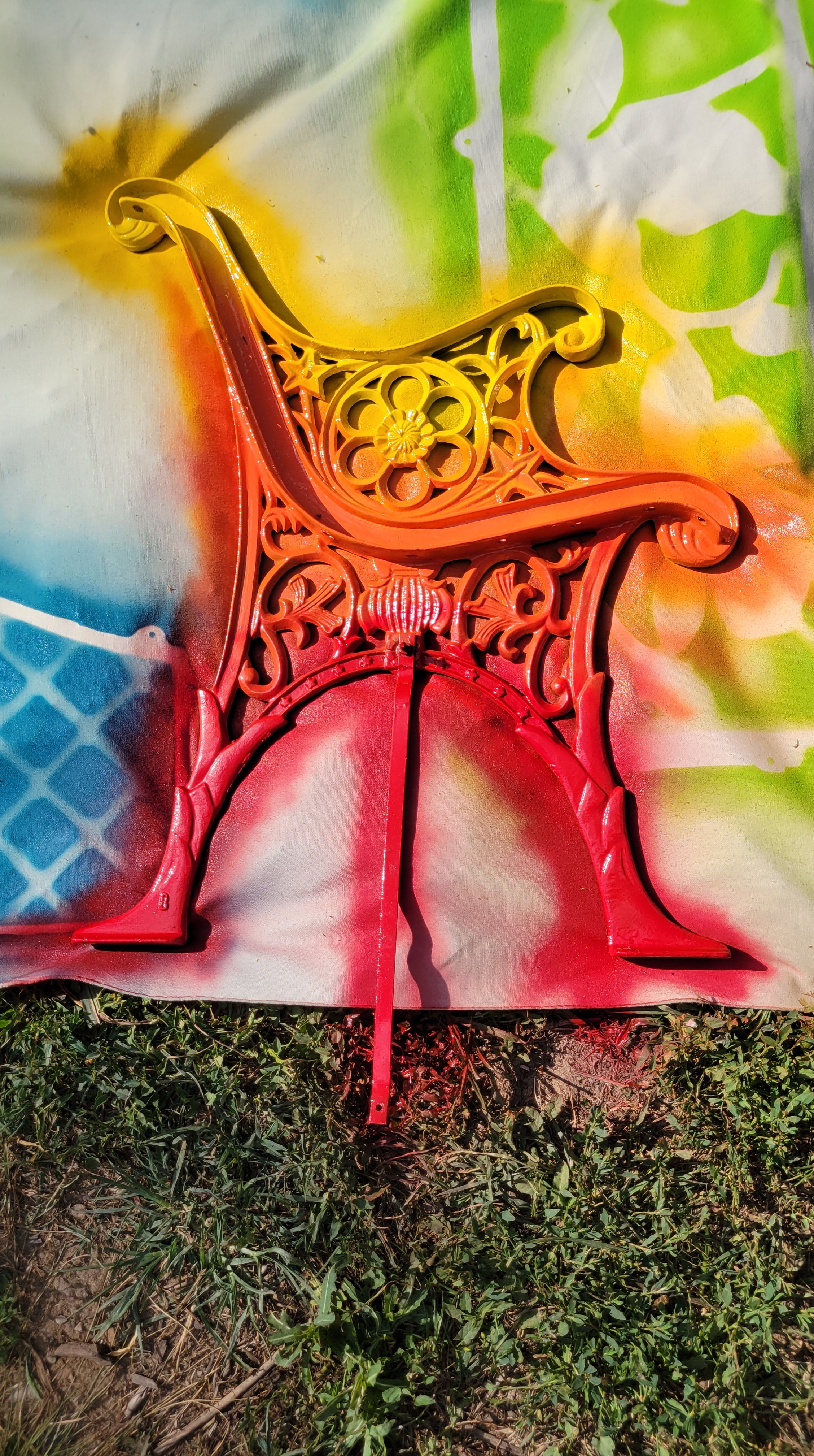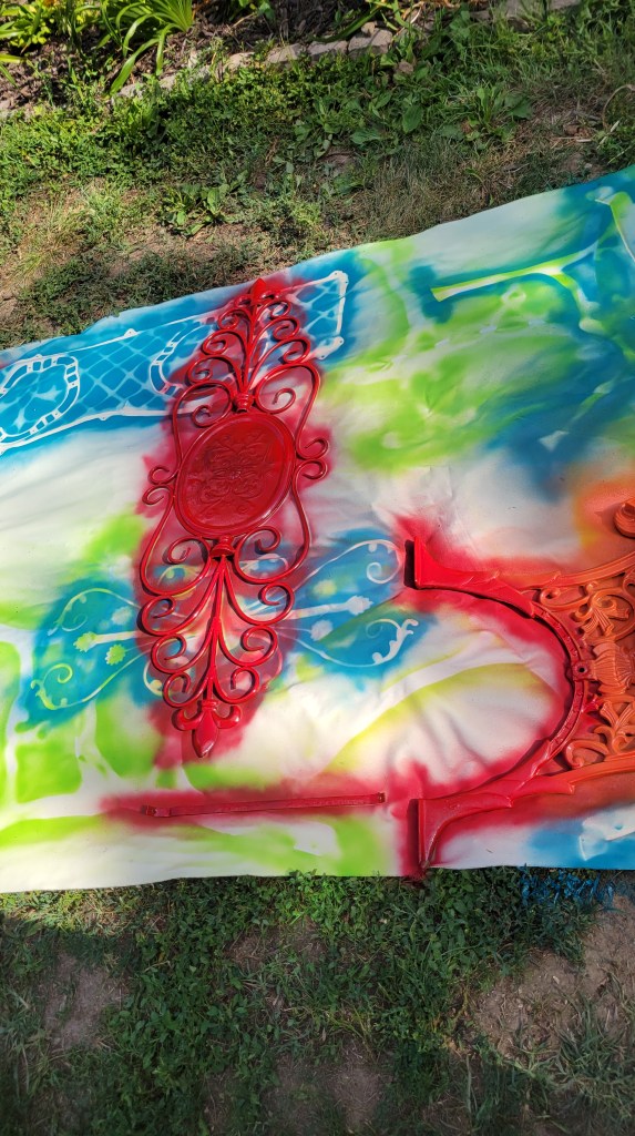 Painting the benches has sped along, and I made the opportunity to spray metal wall hangings I’ve been gathering for fence panels for the flower beds.