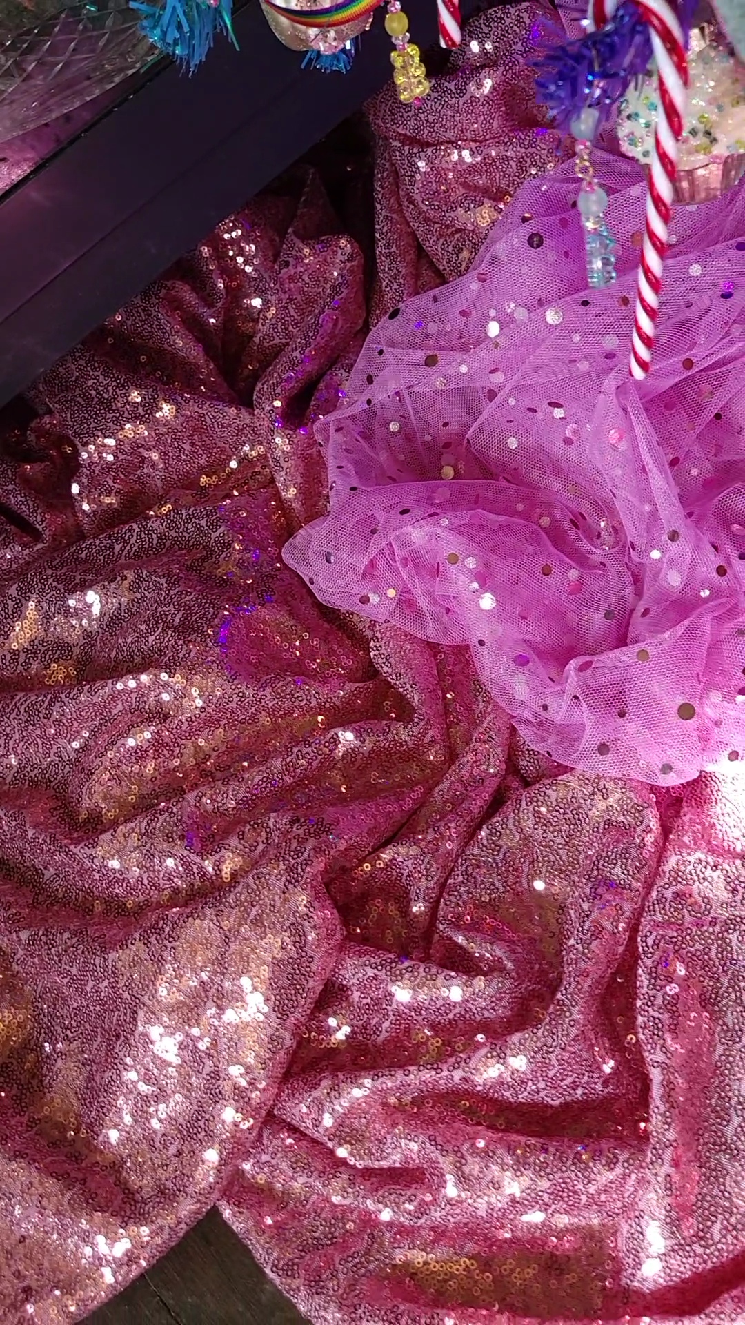 The tree skirt is a shear drapery panel over a huge piece of pink sequined fabric that I found thrifting.