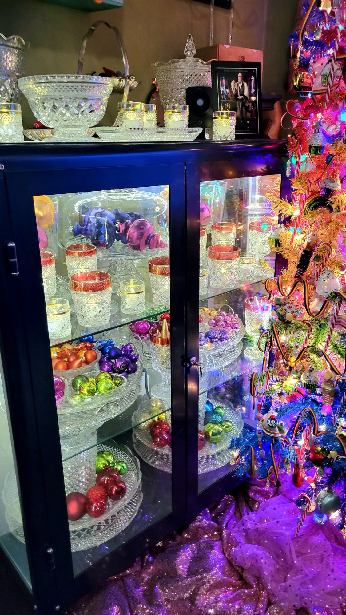 The glassware cases have gotten some attention for the holidays. I have been branching out into color flash Wexford for the collection.
