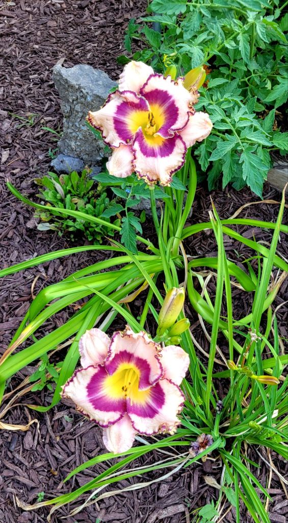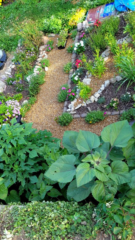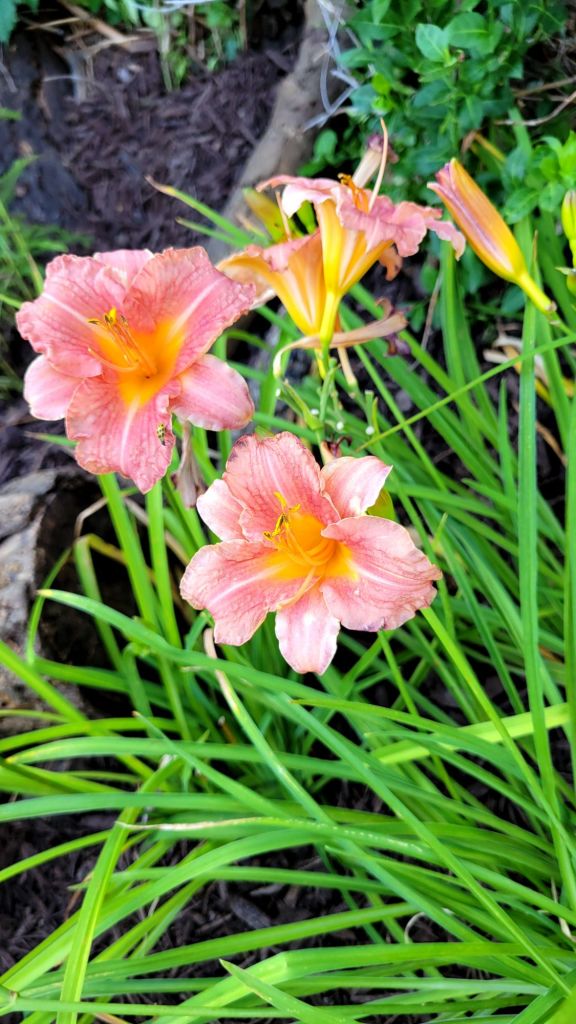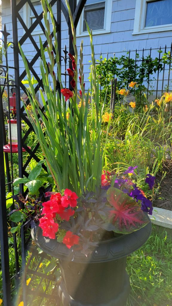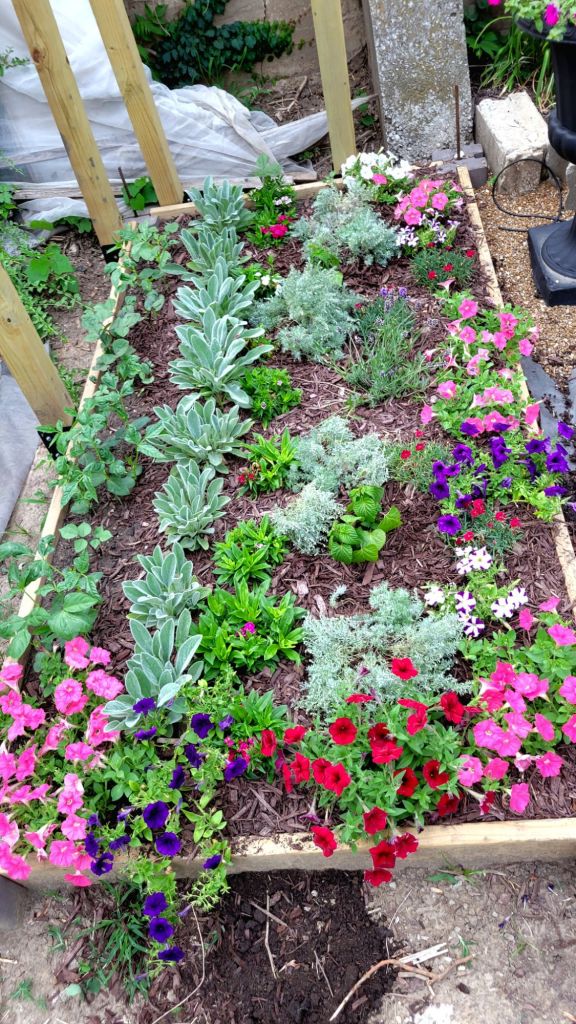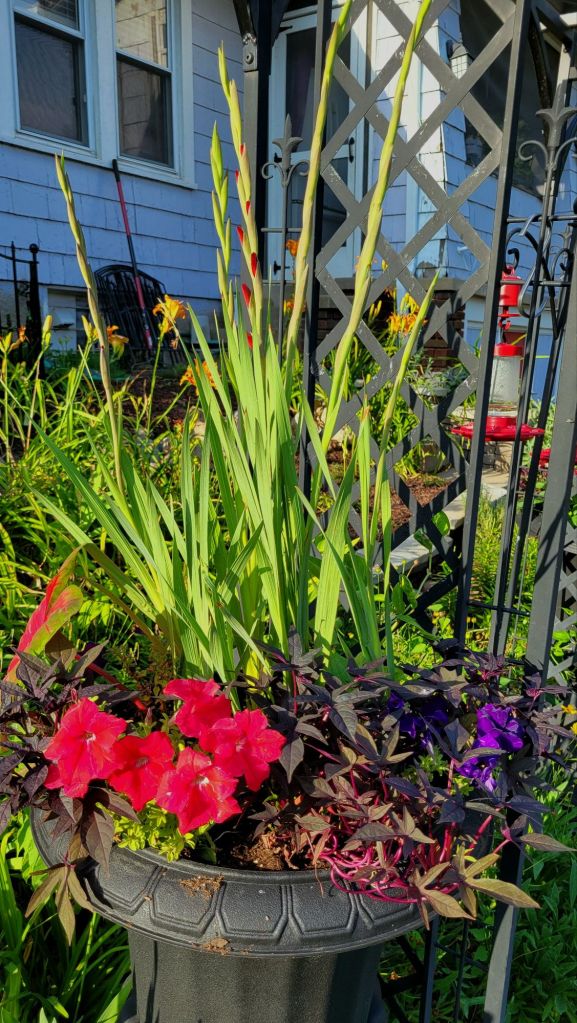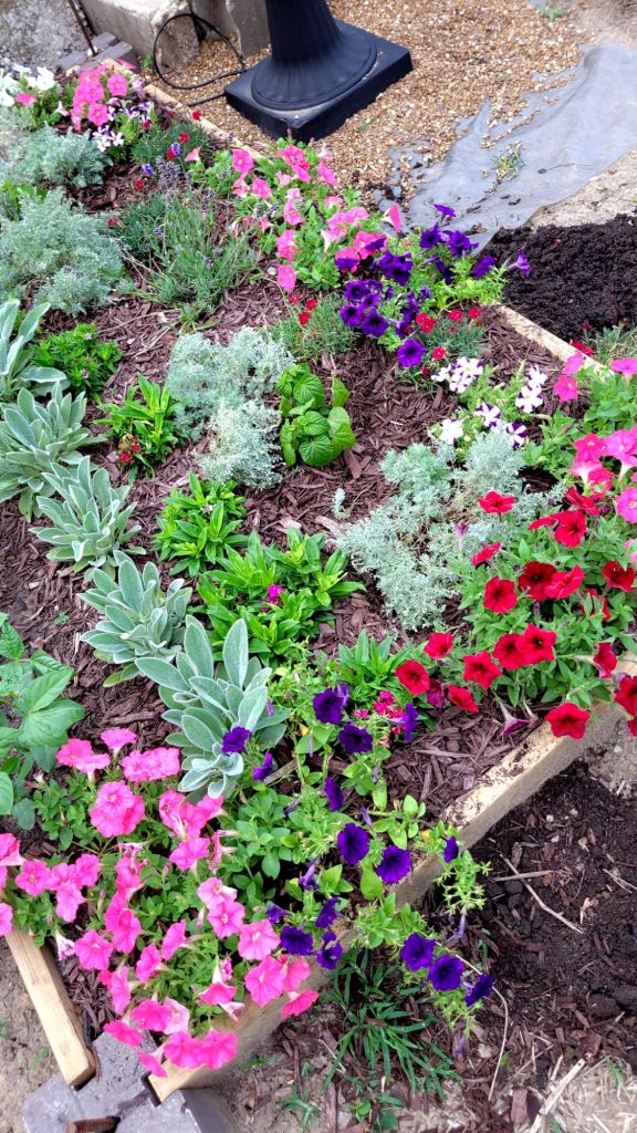 ‘blue by you’ salvia, ‘scarlet breeze’ daylilies, euonymus, pink vinca,
