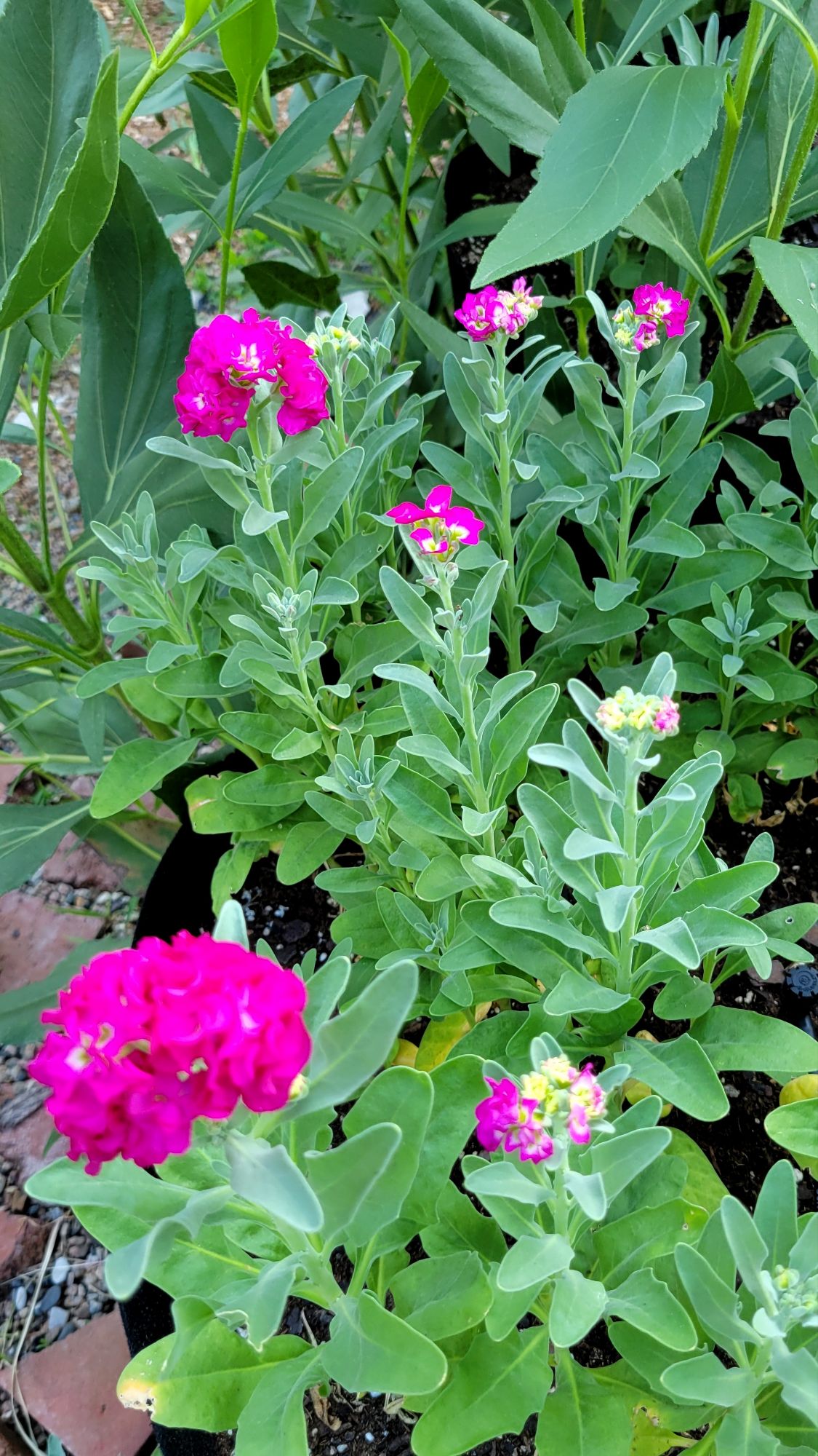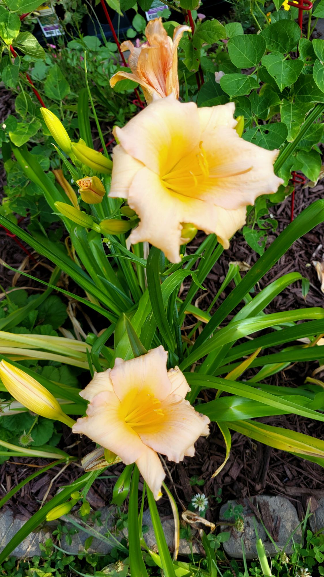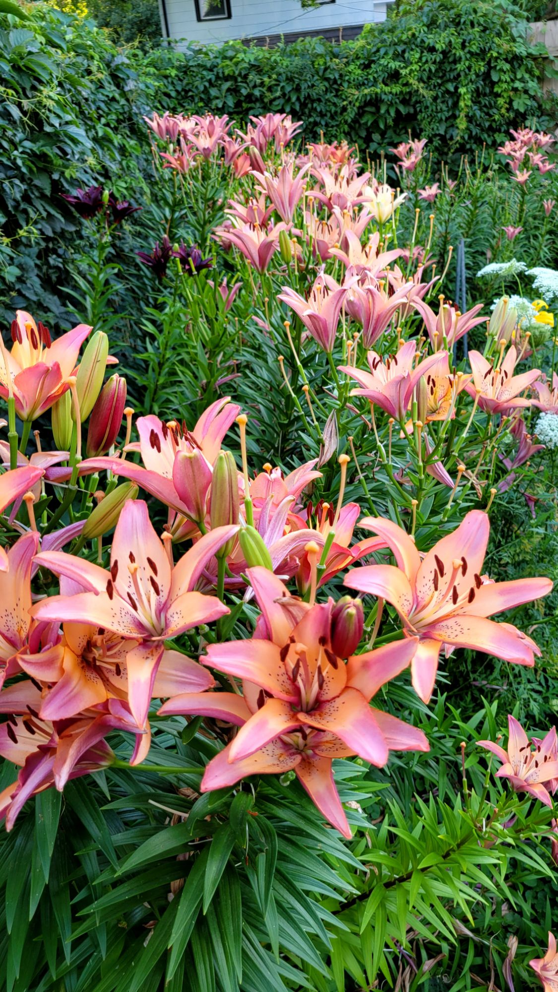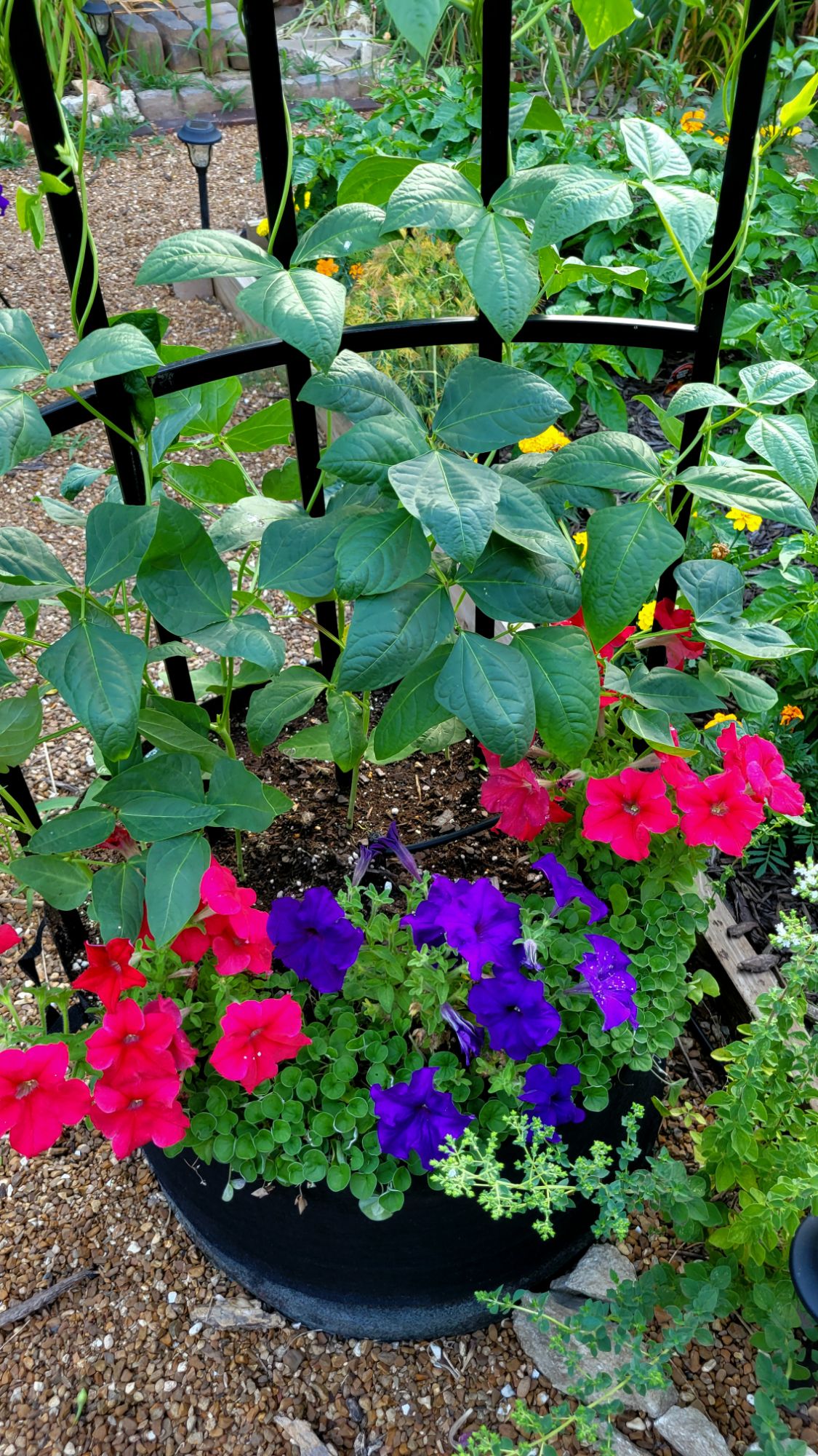 ‘blue by you’ salvia, ‘scarlet breeze’ daylilies, euonymus, pink vinca,