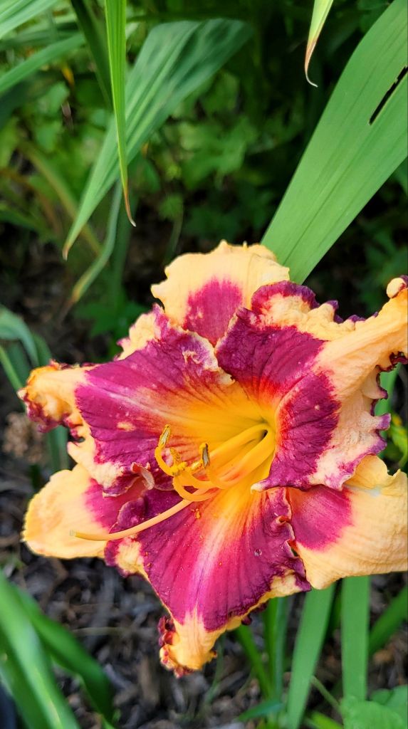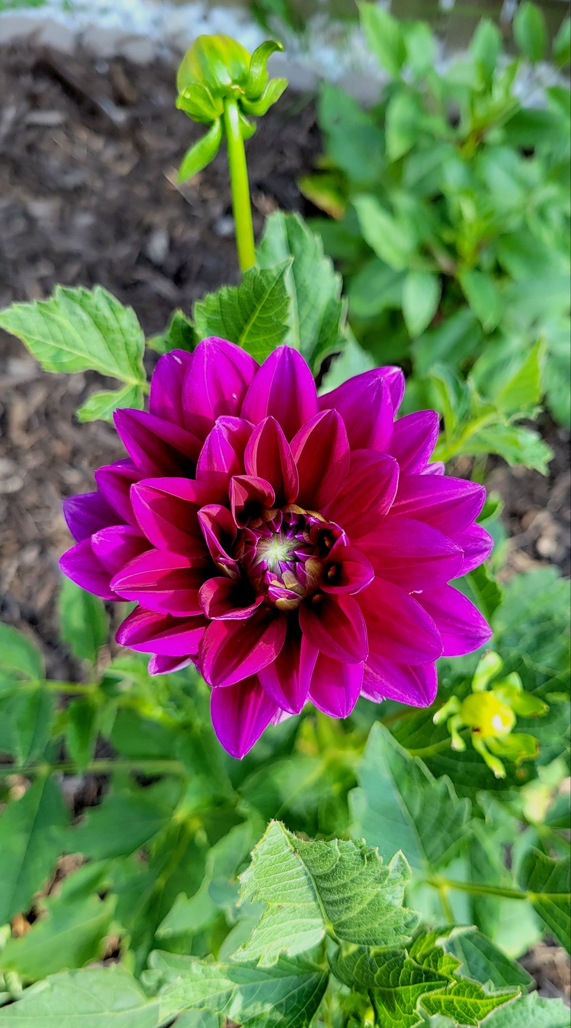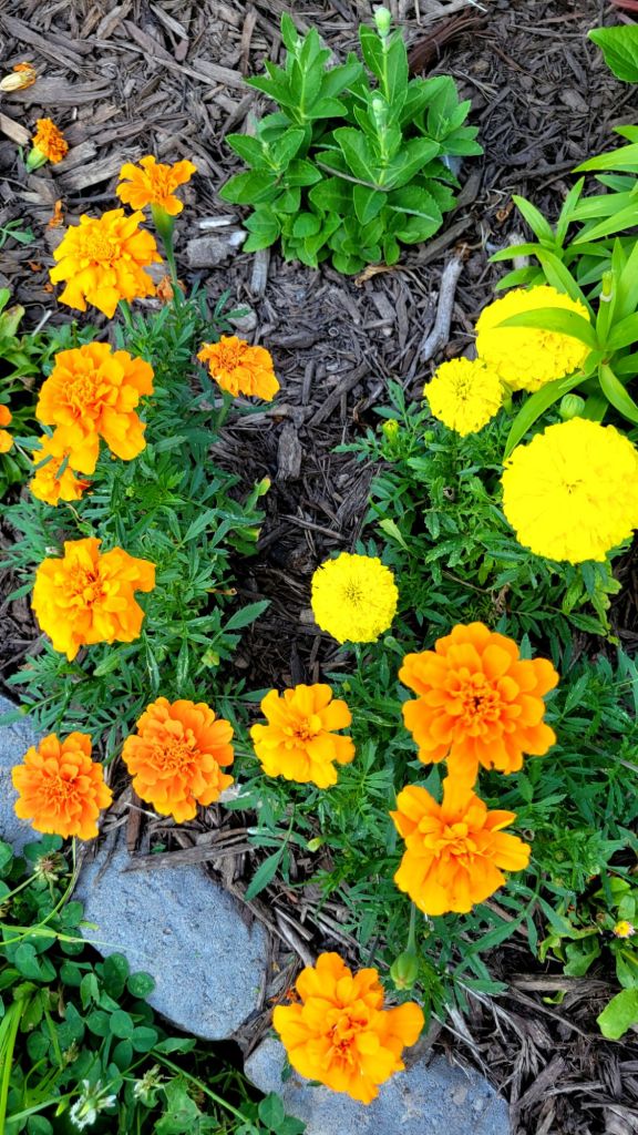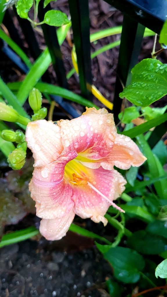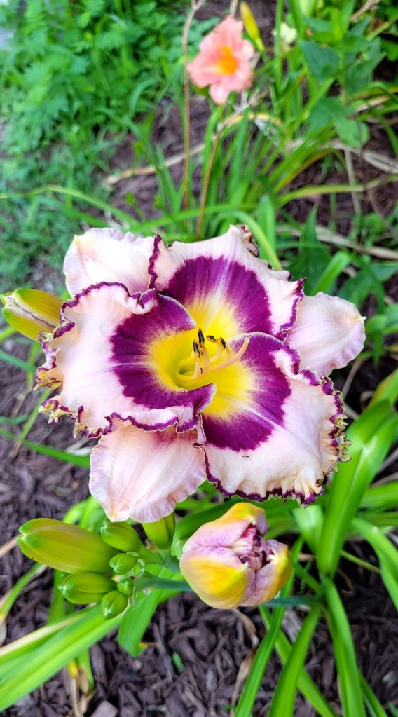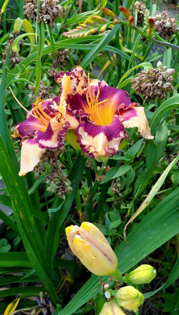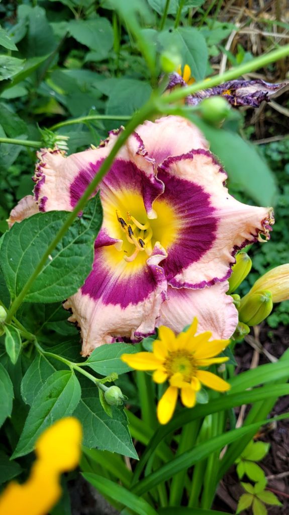 ‘blue by you’ salvia, ‘scarlet breeze’ daylilies, euonymus, pink vinca,