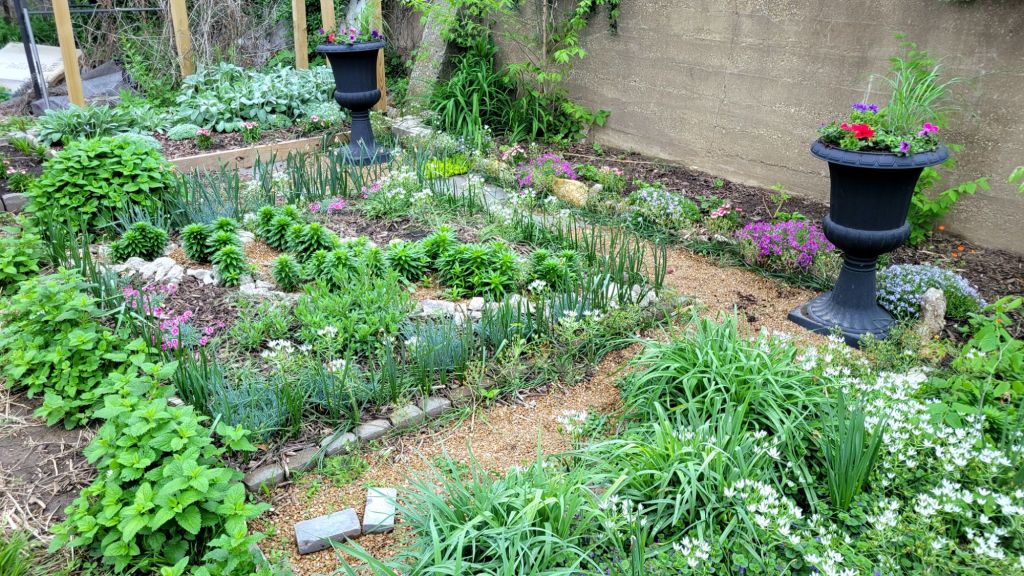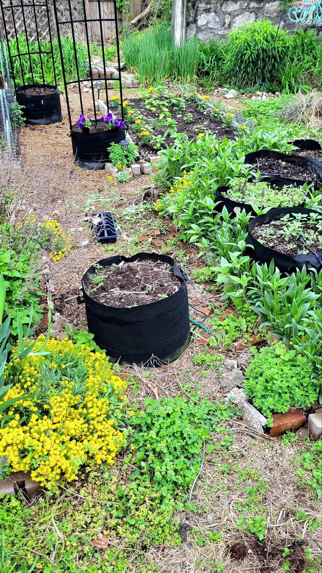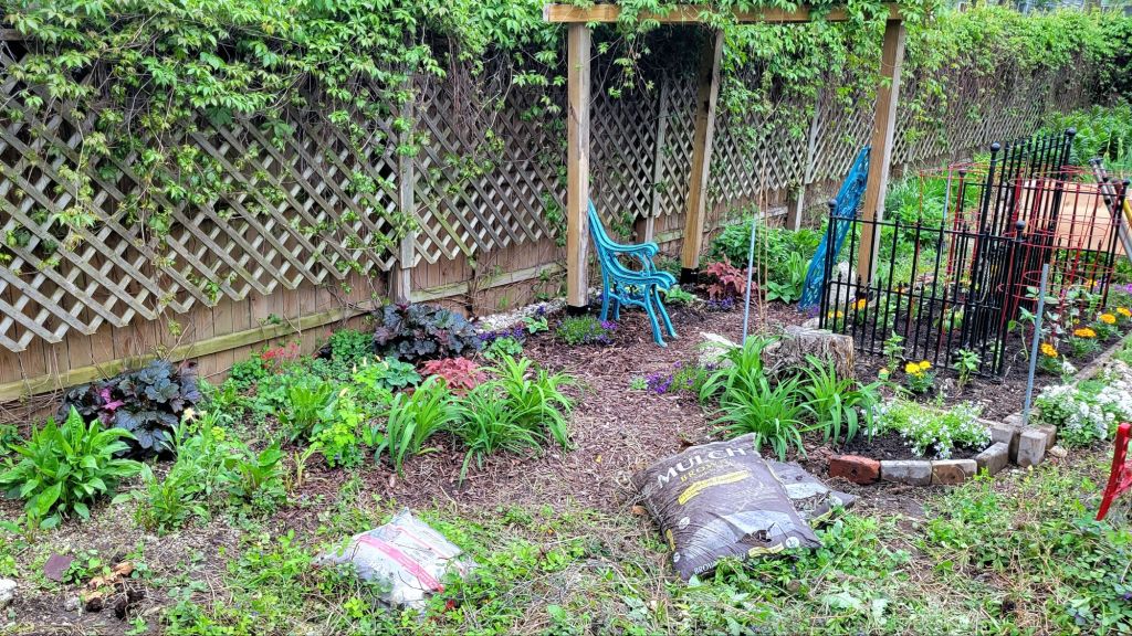 Our county has free yard waste dropout every Saturday, so that’s where I started, bagging and hauling away seven yard bags worth of last year’s debris. Then, I made two extra stops for compost and topsoil for the potato mound and herb starters for companion plantings.